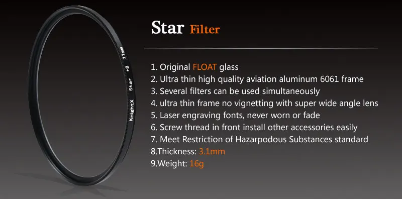 Звездный фильтрЗвездный фильтр или перекрестный экранный фильтр создают звездный узор, в котором линии излучают наружу от ярких объектов.Звездный фильтр придает эффектный перекрестный блеск очень ярким зонам.Предложение для фотографий ночной сцены и девушек, носящих ювелирные изделия или другие предметы с сильным отражением.Спецификация: высококачественное Оптическое стекло для цифровой камеры служит для добавления спецэффектов на цифровую фотографию добавить драматическую восьмикрестовую вспышку в очень яркие области,Эффект мягкого фокуса отлично подходит для фотографирования ювелирных изделий, кристаллов, свечей или других спецэффектов освещенияЭтот фильтр имеет один слой покрытия, нанесенного на обе поверхности для подавления отражения и увеличения передачи на светильникИдеально подходит для фотографирования женщин в ювелирных изделиях или для создания ослепительного эффекта, повышающего сильные отражения от предметовМатериал: оптическое стекло