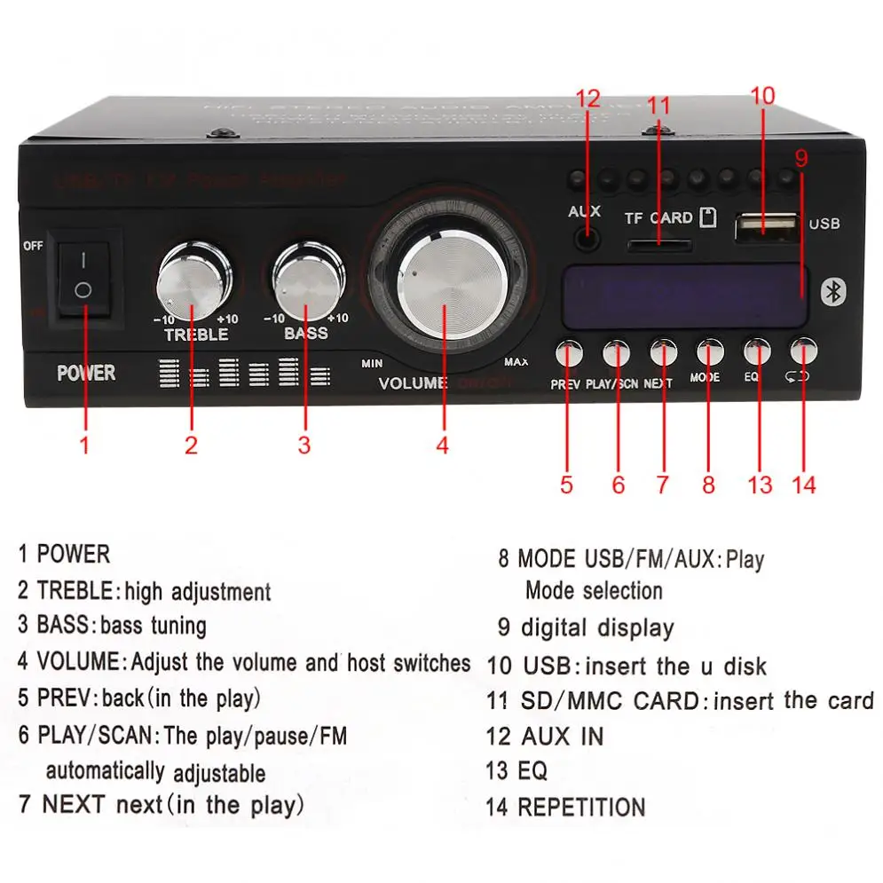 -С интерфейсом USB/SD, может воспроизводить MP3 аудио файлы напрямую, высококачественный внешний входной интерфейс RCA, и может подключать CD/DVD или компьютер и другие аудиоисточники.