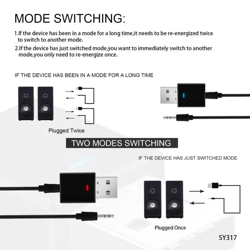Особенность: 1. Этот портативный, легкий беспроводной аудио передатчик и приемник-идеальное беспроводное аудио решение для каждой ситуации и применения. 2. В режиме передатчика он беспроводно передает аудио с телевизора без Bluetooth, домашней стереосистемы или cd-плеера на гарнитуру или динамик для Bluetooth 3,в режиме приемника, он беспроводной передачи аудио с мобильных телефонов с поддержкой Bluetooth, планшетов или компьютеров на проводные стерео, колонки или наушники 4. универсальная совместимость --- с помощью прилагаемого кабеля 3,5 мм, Этот приемник и адаптер передатчика используется для вашего компьютера, ноутбука, домашней стереосистемы, наушников, смартфона, MP3-плеера, CD плеера и т. д. 5. этот адаптер для Bluetooth является как приемником, так и передатчиком, Который прост в эксплуатации и может свободно отправлять и получать все аудиосигналы 6.так как это приемник, он может отправлять музыку с вашего компьютера или так далее на наушники, динамик и т. Д., рисование себя в музыкальном мире, не требуя устанавливать слишком много вещей Спецификация: Номер модели: SY317 Версия Bluetooth: 5,0 и EDR технология: BT5.0, AVRCP (только режим приемника), A2DP Рабочий диапазон: до 10 м/33 футов (без препятствий) режим передатчика: красный светодиодный свет включен в режим приемника: синий светодиодный свет на Размер: 3,2x1,7x0,82 см/1,26x0,67x0,32 дюйма Вес: 3,2 г/0,11 унций переключения режимов: A) сначала Подключите продукт к usb-порту и включите его. B) когда время включения питания в течение 10 секунд, необходимо повторно подключить и отсоединить режим переключения один раз. В) Когда питание заряжено более 10 секунд, его необходимо повторно подключить и дважды отключать для переключения режимов. Примечание: Когда время загрузки этого продукта превышает 10 секунд, режим будет запоминан, и следующий раз загрузки будет последним режимом. Примечание: Из-за разницы в экране, цвет может немного отличаться от того, что вы ожидаете, пожалуйста, позвольте ему упаковать включает в себя: 1 х адаптер для Bluetooth