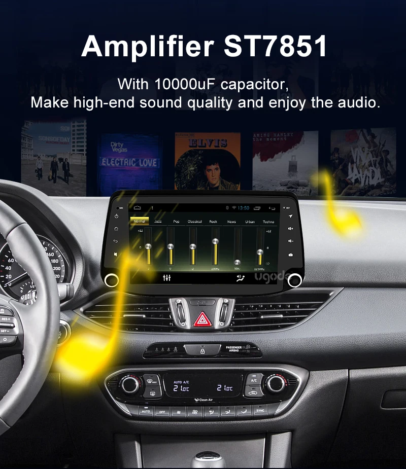 * Процессор: ARM Cortex A9 quad core 1,6 GHz * RAM : 1GB Sumsung DDR3 (2G опционально) * ПЗУ: 16 Гб Toshiba Flash (32G опция) * MCU: ST 8S207 * Графический процессор: Mali-400 3D графический двигатель * Радио тюнер: Philips NXP 6686 * Аудио IC: ST7729 * Усилитель IC: ST7851 * BT модуль: CSR BC6 с анти-эхо ic * Hanstar A + противотуманные высокой четкости LCD 1024*600 * Высококачественный стеклянный емкостный сенсорный экран * DVD лазер: Sanyo 860C * Постоянной ёмкости, универсальный конденсатор: Lelon * GPS Чипсет: U-Blox