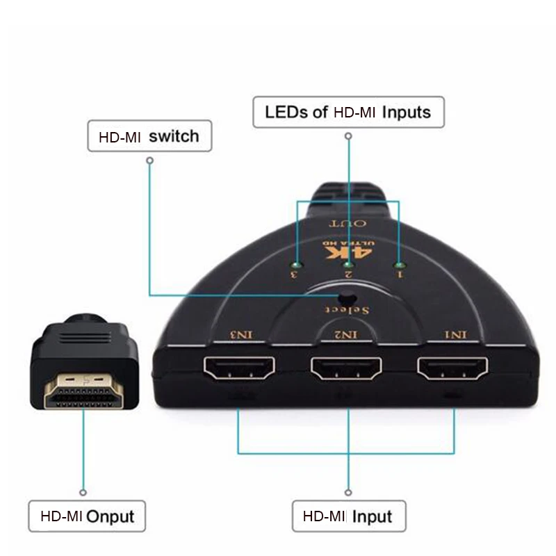 Этот 3 входа в 1 выходной HD-MI коммутатор имеет функцию переключения клавиш и имеет функцию интеллекта. 3 входа в 1 выход HD-MI переключение направляет видео высокой четкости 4k * 2k и цифровое аудио из любого из 3 источников для отображения блока. Три входа обеспечивают одновременное подключение источников видео высокой четкости, таких как hd-проигрыватель, Blu-Ray плеер, телеприставка, P & S3, Xbox360 и т. Д. Выход посылает аудио/видео сигналы высокой четкости на дисплей высокой четкости, такой как HDTV.