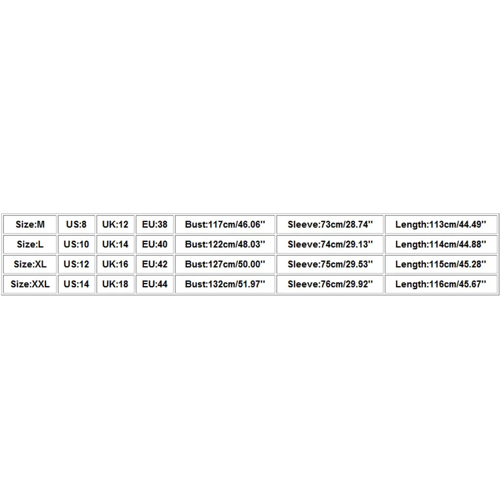 What you get:1PC Women Coat Please note that slight color difference should be acceptable due to the light and screen. Size US UK EU Bust Sleeve Length M 6 10 36 117cm/46.06'' 75cm/29.53'' 112cm/44.09'' L 8 12 38 122cm/48.03'' 76cm/29.92'' 113cm/44.49'' XL 10 14 40 127cm/50.00'' 77cm/30.31'' 114cm/44.88'' XXL 12 16 42 132cm/51.97'' 78cm/30.71'' 115cm/45.28''