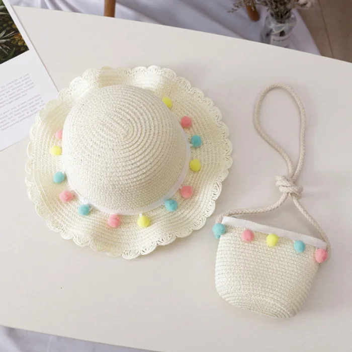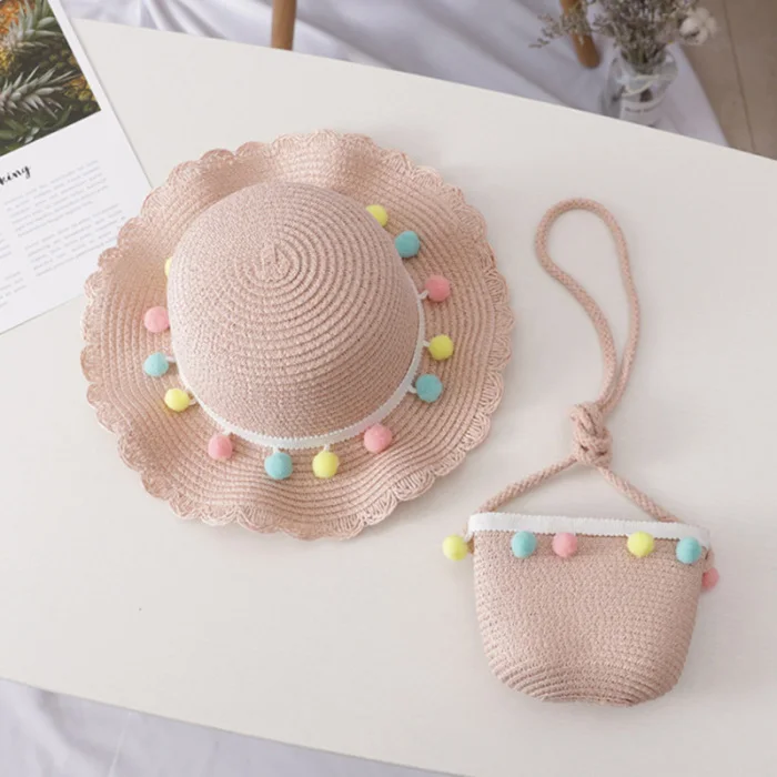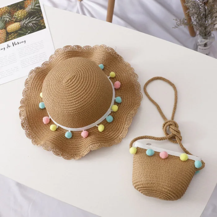 Хит продаж 2019, модная шляпа, сумка, набор, волнистые соломенные шляпы, цветные шары, кепка, сумка на одно плечо для детей, весна-лето, Пляжная J9