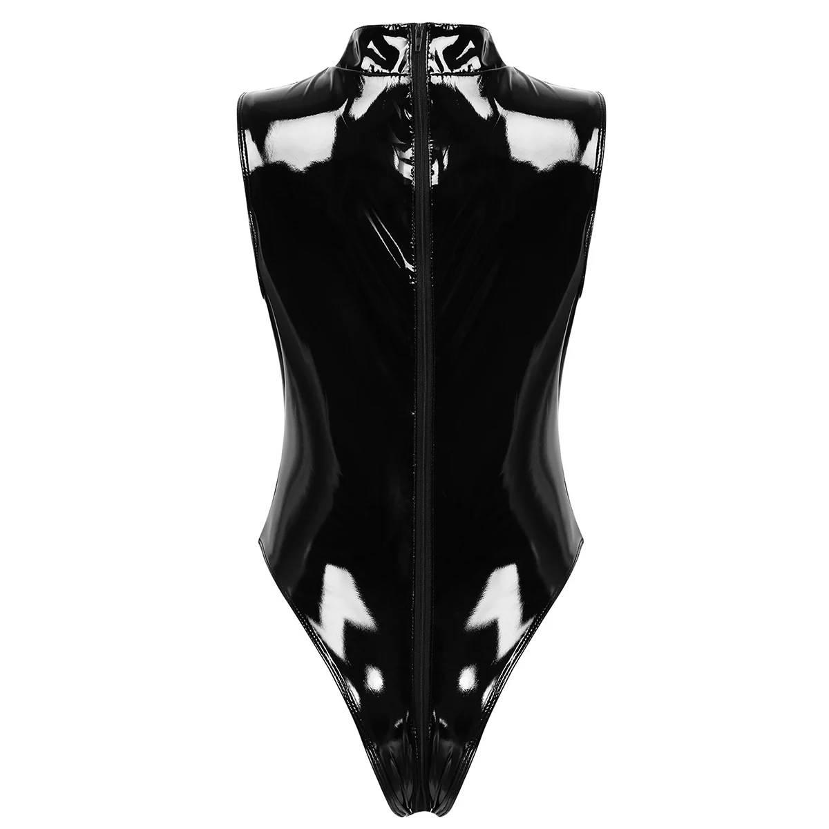 Женский Цельный боди из лакированной кожи с высоким вырезом, внешний вид мокрый.