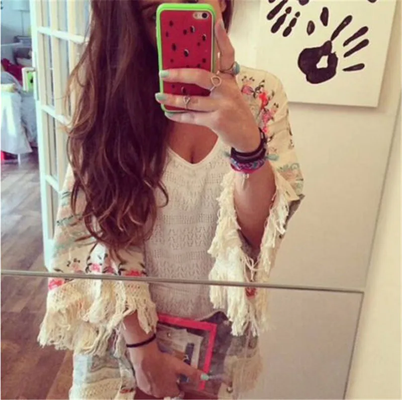 Женский накидка на бикини, кардиган с цветочным принтом на рукавах летучая мышь, накидка на бикини, свободный халат с кисточками для купальных костюмов