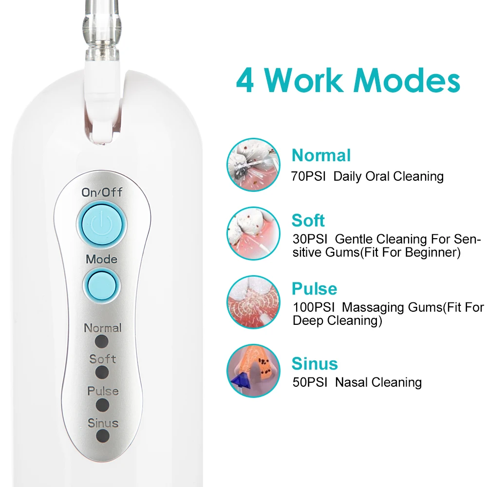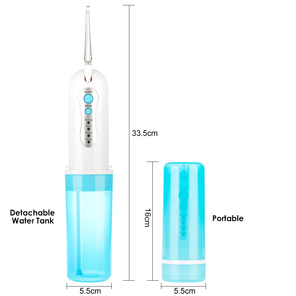 Описание товара1. Название продукта: 100% новый бренд ирригатор полости рта для взрослых2. Модель: SKU 1100033. Сертификация: 3C,CE,FC,FDA,RoHS4. Материал корпуса: 100% высококачественный АБС-пластик5. Материал резервуара для воды: 100% высококачественный ПК6. Особенности: многофункциональный al/портативный/IPX7 водонепроницаемый/4 регулируемых режима работы/сильное давление воды/Портативная USB зарядка/Съемная большая емкость 240 мл резервуар для воды/4 x различные функции ирригатор полости рта струйные наконечники/1 x носовые насадки для чистки/вращающиеся насадки на 360 °/Дорожный Чехол-1 шт.7. Входное напряжение адаптера питания: Совместимо с мировым напряжением (100-240 В)8. Вход: 5 В постоянного тока, 1 А9. Выход: DC 3,7 V,4-6 Вт10. Режимы работы: 4 регулируемых режима работы (нормальный, мягкий, импульсный и синус)11. Тип резервуара для воды: Съемный большой объем 240 мл резервуар для воды12. Диапазон давления воды: 30-100 PSI13. Тип батареи: перезаряжаемая литиевая батарея 2000 мАч14. Метод зарядки: Портативная USB зарядка15. Время зарядки: 4 часа16. Время работы полностью заряжено: 15 дней (работает два раза каждый день) или непрерывная работа 2 часа17. Размер посылка: Приблизительно 21 см x 11 см x 7 см18. Вес/педикюра задняя часть: около 0,6 кг Посылка включает в себя:1 x ирригатор для полости рта(Без насадок)4 x Сменный ирригатор для полости рта1 x Сменный носовойИрригаторНаконечники для струи1 х USB кабель для зарядки(Адаптер питания не входит в комплект)Дорожный Чехол-1 шт.Руководство по эксплуатации-1 шт.1 x коробка для посылка Теплые советы:1. Пожалуйста, внимательно прочитайте все инструкции перед использованием2. Если вы хотите использовать с водой, полосками для полоскания рта или антибактериальными полосками, Следуйте рекомендациям ваших стоматологов или гигиенистов3. Не обращайте внимания на глаза при включении ирригатора полости рта