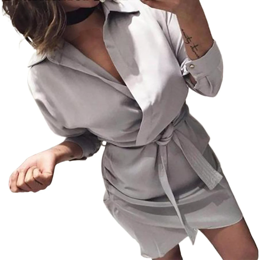 Осеннее однотонное женское мини-платье с длинным рукавом и отложным воротником и поясом
