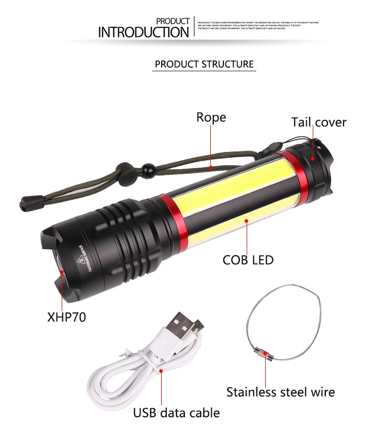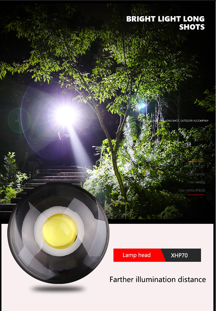 Самый мощный XHP70 + COB светодиодный светильник для вспышки, 7 режимов, светильник для вспышки, перезаряжаемый зум, водонепроницаемый фонарь, Lanterna, 5000 мАч, аккумулятор для кемпинга