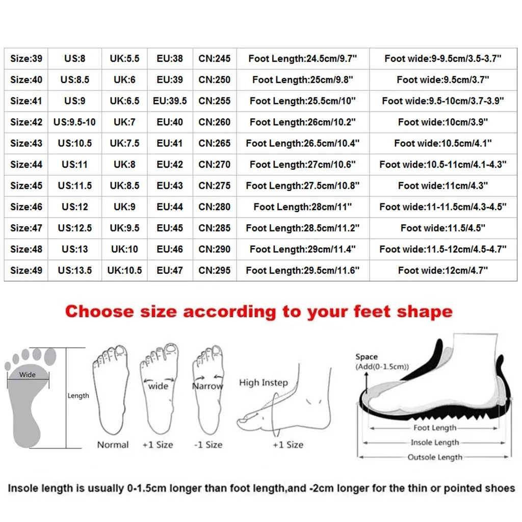 Размер Свяжитесь с нами Великобритания ЕС CN Foot Длина При покупке обувь на широкую ногу 39 8 5,5 38 245 24,5 см/9,7" 9-9,5 см/3,5-3,7" 40 8,5 6 39 250 25 см/9,8" 9,5 см/3,7" 41 9 6,5 39,5 255 25,5 см/10" 9,5-; высотка каблука 10 см/3,7-3,9" 42 9,5-10 7 40 260 26 см/10,2" Высота каблука 10 см/3,9" 43 10,5 7,5 41 265 26,5 см/10,4" 10,5 см/4,1" 44 11 8 42 270 27 см/10,6" 10,5-11 см/4,1-4,3" 45 11,5 8,5 43 275 27,5 см/10,8" 11 см/4,3" 46 12 9 44 280 28 см/11" 11-11,5 см/4,3-4,5" 47 (Европа) 12,5 9,5 45 285 28,5 см/11,2" 11,5/4,5" 48 13 10 46 290 29 см/11,4" 11,5-12 см/4,5-4,7" 49 13,5 10,5 47 (Европа) 295 29,5 см/11,6" 12 см/4,7"