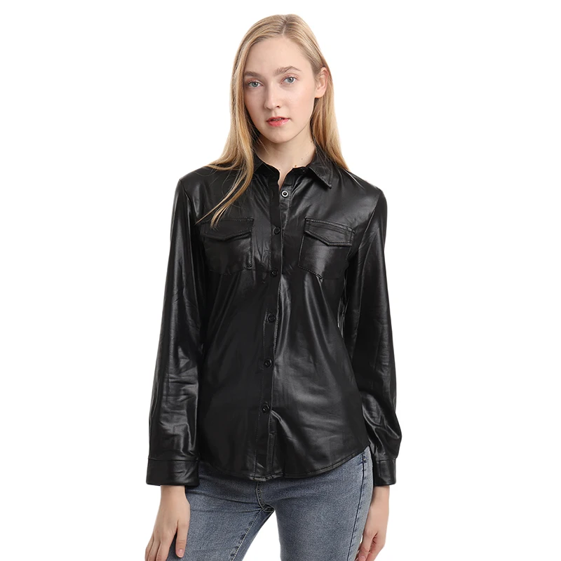 Новинка, женские блузки из искусственной кожи, сексуальные женские топы с длинными рукавами и пуговицами, женская уличная одежда, повседневные шикарные рубашки lusas