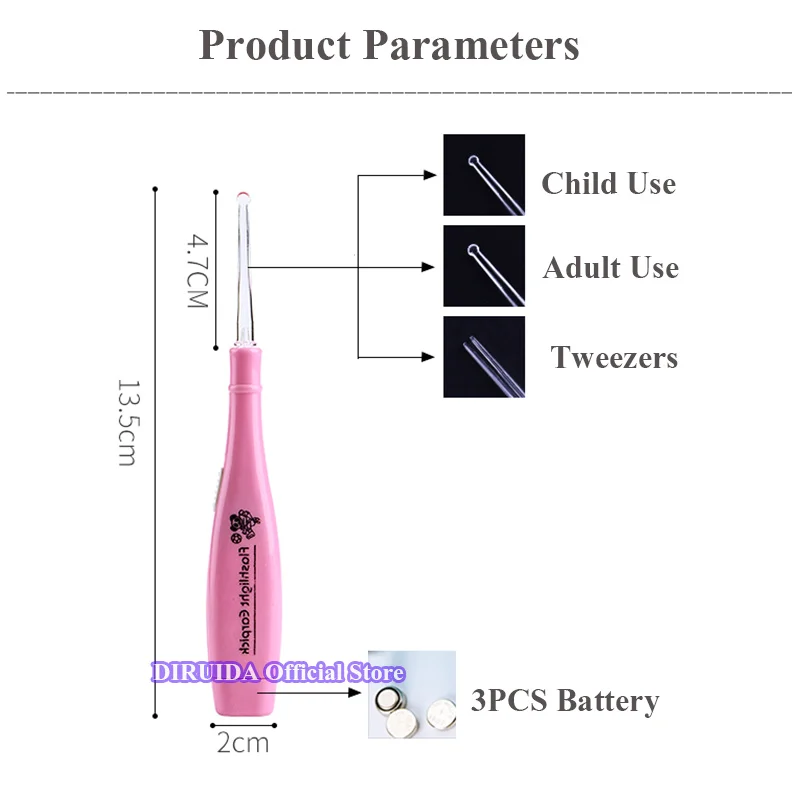 1. Фонарик для четкого просмотра отверстия для уха. 2. Может использоваться как фонарик, когда вы находитесь в темноте. 3. Пинцеты оснащены, чтобы поймать большой ушной воск. 4. Два типа амбушюры, т. Е. Толстые и тонкие, доступны для различных размеров отверстий для ушей взрослых и детей. 5. Светильник на наушнике должен быть выключен после использования. Если он не используется в течение длительного периода времени, выньте аккумулятор в чехол, повреждая изделие. 6. Если аксессуары не используются в течение длительного периода времени, храните их в трубке в конце уха, который должен быть покрыт крышкой.