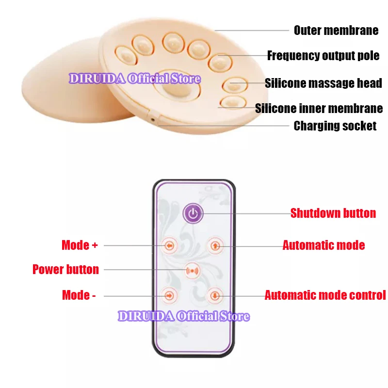 Способ работы: ① Нажмите кнопку запуска на массажном устройстве в течение длительного времени, пока не появится Красный Сигнальный светильник. ② После ношения нижнего белья массажное устройство помещается в нижнее белье (как и коврик для груди). ③. Пресс ключ дистанционный пульт, и массажное устройство откроется в автоматическом режиме по умолчанию.