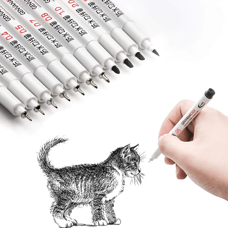 Этот черный тонкий набор ручек включает в себя 12 размеров наконечника; 0,050,10,20,30,40,50,70,81,02,03,0 гЩеткаРучка
