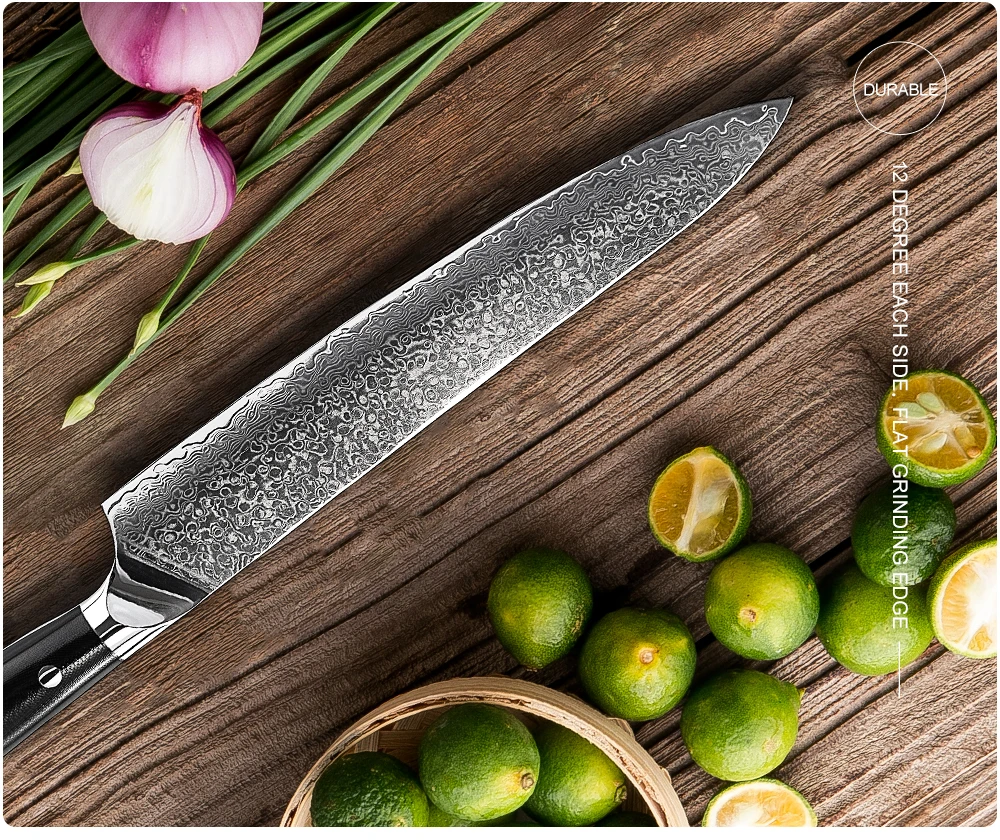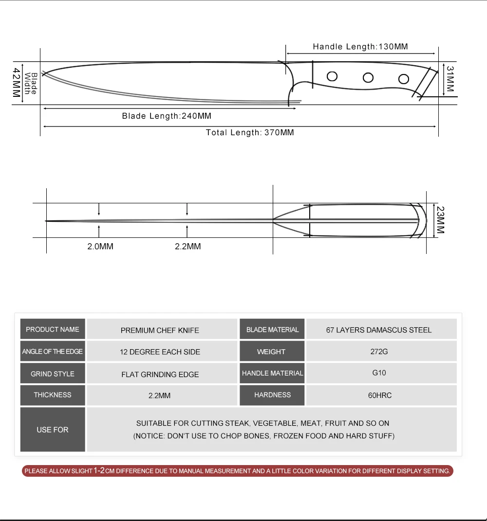 Длина: 370 ммДлина лезвия: 240 ммШирина лезвия: 42 ммТолщина: 2,2 мм.Изготовлен из 67-слой дамасской Сталь импортируется из Японии. VG-10 стальной режущий сердечник;