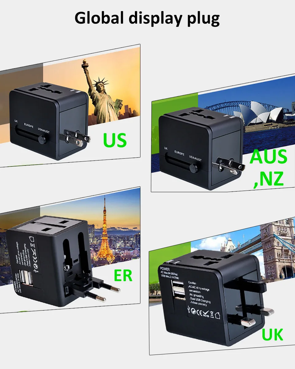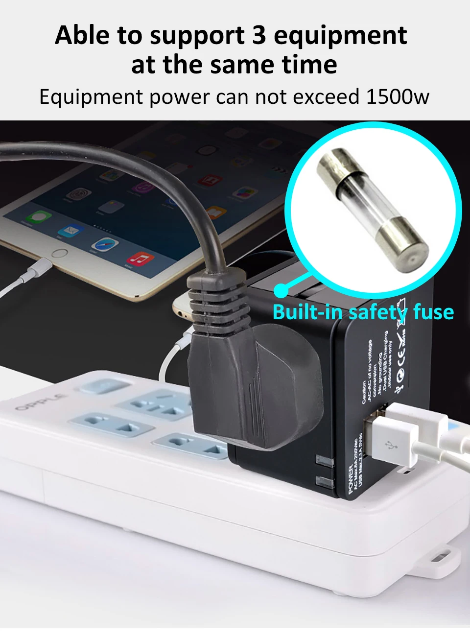 Все в одном адаптере Идеально подходит для путешествий Компактный и легкий Действительно удобно в использовании, отвечает всем вашим потребностям везде Вам не нужно носить отдельные зарядные устройства или иметь несколько адаптеров везде, где вы идете, этот продукт является идеальным решением. Международный адаптер: дорожный адаптер охватывает более 150 стран с вилками для США/ЕС/Великобритании/Австралии и мощными двумя портами USB. Умные 2 usb-порта: Это универсальное зарядное устройство совместимо практически со всеми usb-устройствами, такими как смартфоны, bluetooth-колонки, цифровые камеры и так далее. Это универсальное зарядное устройство совместимо практически со всеми usb-устройствами, такими как iPhone 7/6S/5S/4S, для Samsung Galaxy S7/S6/S5/S4, для Sony, для Nokia, для HTC, LG, HUAWEI, ZTE, bluetooth-динамик, цифровые камеры и так далее. Заряжайте 3 устройства: работайте быстрее, не снимая несколько зарядных устройств в отпуске! Компактная и мощная штепсельная Вилка адаптера Full World позволяет одновременно использовать розетку переменного тока и два порта USB. Заряжайте 3 устройства одновременно без каких-либо проблем, очень прост в использовании. Компактный и легкий. Оптимизирована для быстрой, безопасной и эффективной зарядки. Благодаря уникальному внешнему виду этого адаптера по всему миру вы гораздо реже забудете или потеряете этот адаптер в своем гостиничном номере во время путешествий. Это ваш хороший выбор: Универсальный дорожный адаптер-это ваш ответ на эти проблемы питания за рубежом! С превосходной совместимостью на кончиках ваших пальцев, независимо от того, где вы находитесь, вы можете зарядить свои устройства и оставаться на связи в любое время!