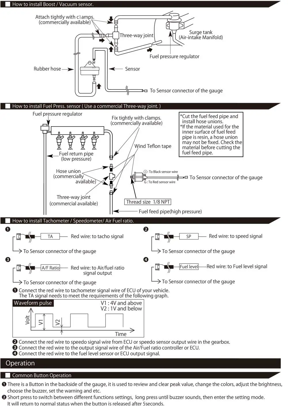 Вольт: 10-15 в температура воды по Цельсию: 20-120 ° Температура воды по Фаренгейту: Температура масла по Цельсию: Температура масла по Фаренгейту 50-150 °: прессовая планка: масло 0-10 бар Масляный Пресс PSI: 0-140PSI об/мин: 0-9000 об/мин вакуум: -1-бар бустер бар: -1-2 бар бустер PSI: -30PSI BOOST 3 бар: -1-3 бар EXT температура: 200-1100 ° соотношение воздушного топлива: Топливный пресс-бар 10-20: 0-6 бар топливный пресс PSI: 0-80PSI Trans Temp: 80-260 ℉ 1, этот датчик работает с шаговым двигателем и электронным датчиком. 2, более быстрый и точный шаговый двигатель. 3, турбо-датчик, Вакуумный датчик, EXT датчик температуры, датчик давления масла, вольтметр, датчик температуры масла, датчик температуры воды, Тахометр и Вакуумный датчик доступны. 4, калибровочные циферблаты невидимы, пока выключатель зажигания выключен. Как только включится переключатель зажигания, появится прозрачный светодиодный дисплей с белым освещением. Указка с красным излучающим наконечником повышает видимость. 5, цвет освещения может регулироваться от белого и янтарного Красного 6, двойная Предупреждение, светодиодный фонарь метра и звуковой сигнал 7, только для автомобилей 12 В 8, без блока управления 9, это универсальные измерительные приборы, которые подходят для любого автомобиля 10, великолепный режим открытия и конечная модель. Функции: 1. Пиковая Настройка 2. Цвет на выбор 3. Уровень яркости 4. Тип зуммера 5. Уровень зуммера 6. Открытие церемоний 7. Предупреждение установка 8. Посылка с нулевой регулировкой положения включает в себя: 1 * Датчик 1 * держатель 1 * Датчик (,) 1 * болты, упаковка 1 * Инструкция на английском языке