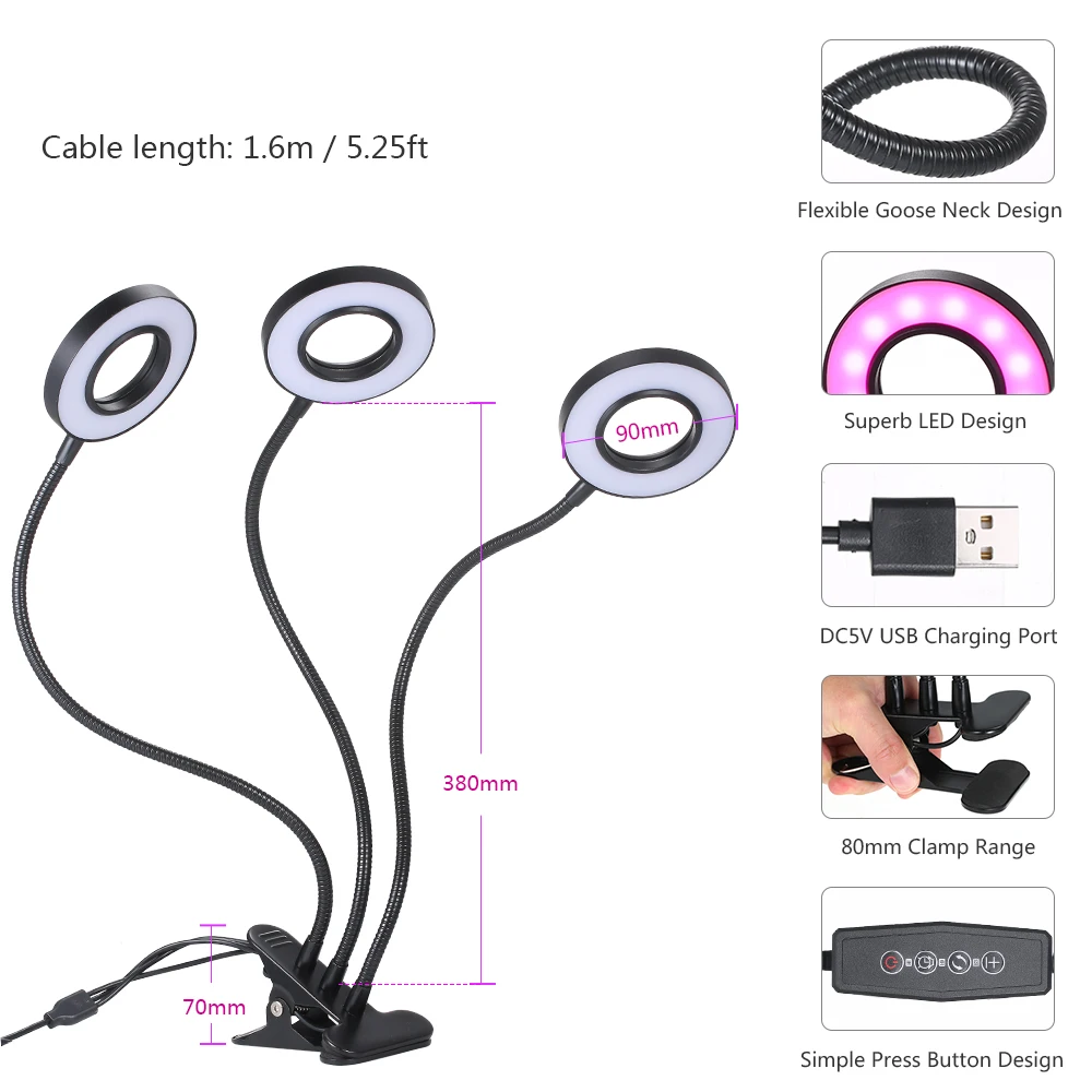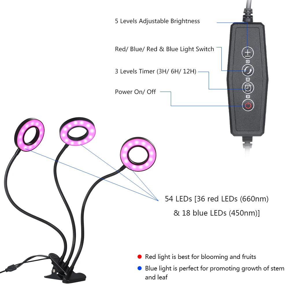 Светильник для выращивания растений способствует ускорению роста зелени. Он содержит 12 красных светодиодов (660 нм), 6 синих светодиодов (450 нм) на каждой трубке. Расширенный светильник для выращивания светодиодов обеспечивает широкий спектр светильник длиной волны 400нм ~ 840нм, который аналогичен солнечному светильник. Красный светильник предназначен для цветения и фруктов, а синий светильник способствует росту стволов и листьев. Оба они могут полностью усваиваться растениями. Предоставьте вашим растениям необходимый светильник. Особенности: Никогда не беспокойтесь о токе, так как его выходное напряжение составляет 5 в постоянного тока, что ниже, чем напряжение безопасности человека 36 В. Вы можете включить/выключить, изменение 3 рабочий Светильник Цвет (синий светильник красные светильник/синего и красного цветов, светильник) для различных период вашего завода, 5 уровней регулируемой яркости и 3 уровня таймера (3 h/6 h/12 h) для обеспечения вашего растения различными потребностями. Мягкий, сгибаемый и складной дизайн гусиной шеи, с 360 ° регулируемый угол освещения, и эта конструкция может высвободить больше места для вас. Он может управляться с помощью предоставленного usb-порта для зарядки, удобного в использовании. Перезагрузите и он включится с яркостью и цветовой температурой, которые вы устанавливаете в последний раз, продуманная функция памяти для вас. Максимальная ширина зажима 80 мм позволяет зажимать в различных местах. 18 ультра-ярких светодиодов на каждой трубке обеспечивают достаточно светильник для роста, полной яркости. Оснащен светодиодами, которые являются энергосберегающими, экономичными, экологически безопасными, низкое энергопотребление, длительный срок службы составляет более 50 000 часов. Отсутствие УФ-излучения, инфракрасного излучения, отсутствие излучения. Он подходит для теплицы, балкона, завода, фермы и так далее. Технические характеристики: