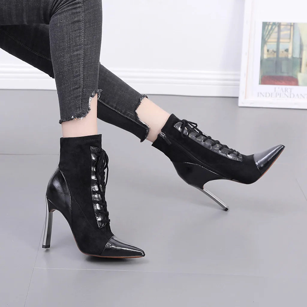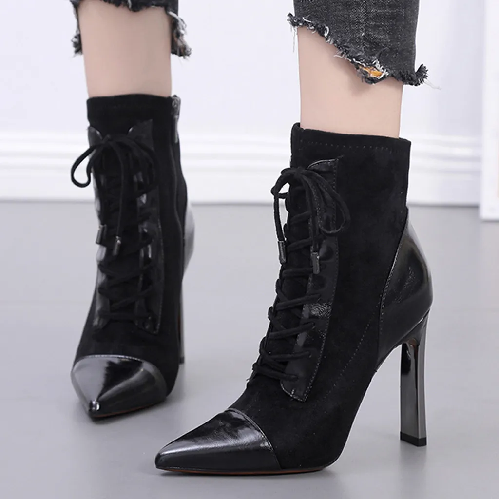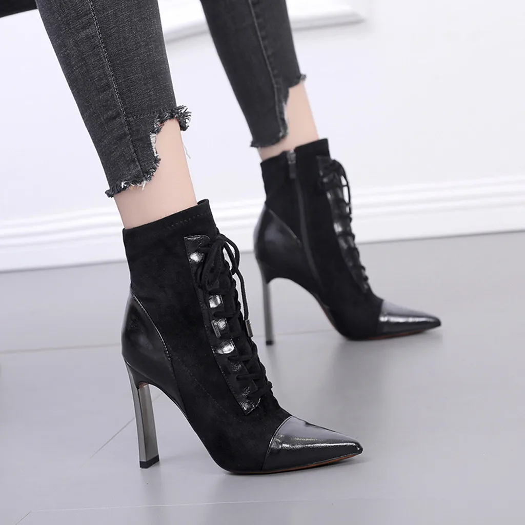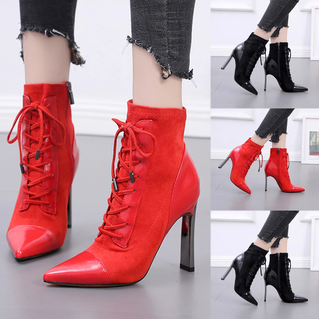 Женская обувь на высоком каблуке с острым носком; Женская обувь на шпильках с боковой молнией и перекрестной шнуровкой; Короткие ботинки