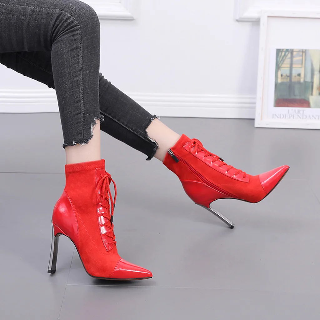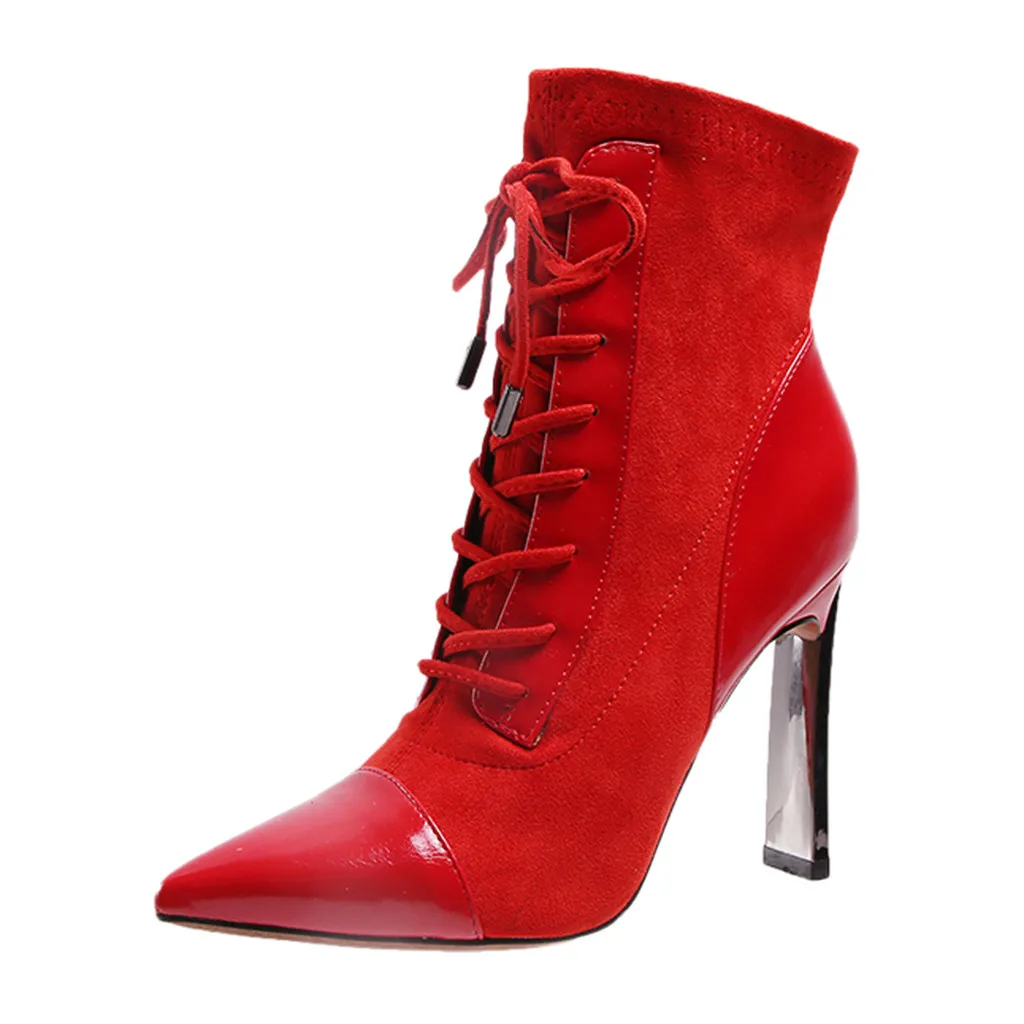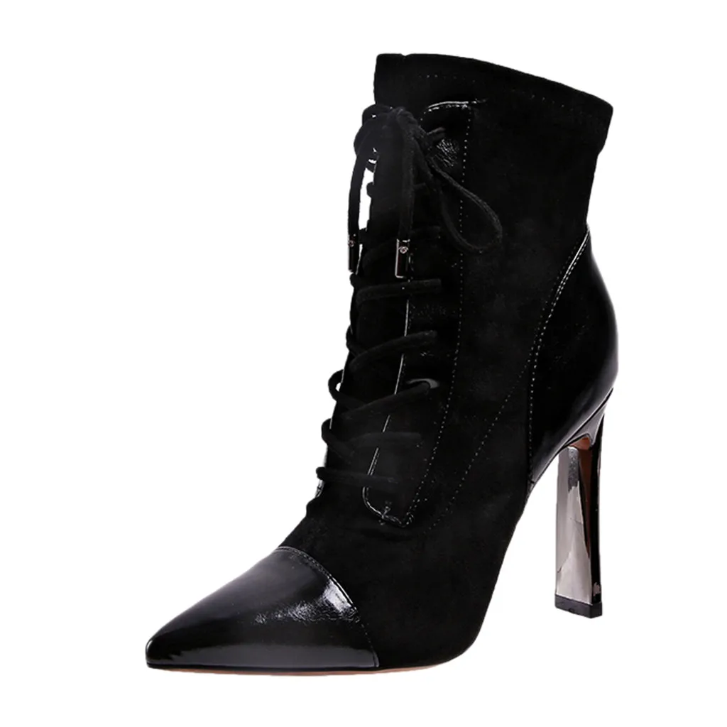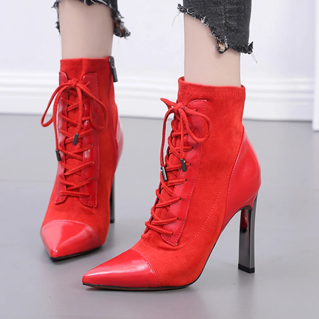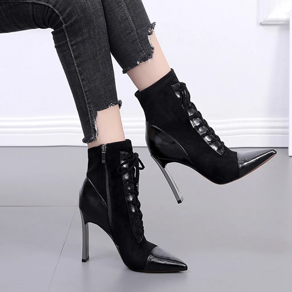 Женская обувь на высоком каблуке с острым носком; Женская обувь на шпильках с боковой молнией и перекрестной шнуровкой; Короткие ботинки