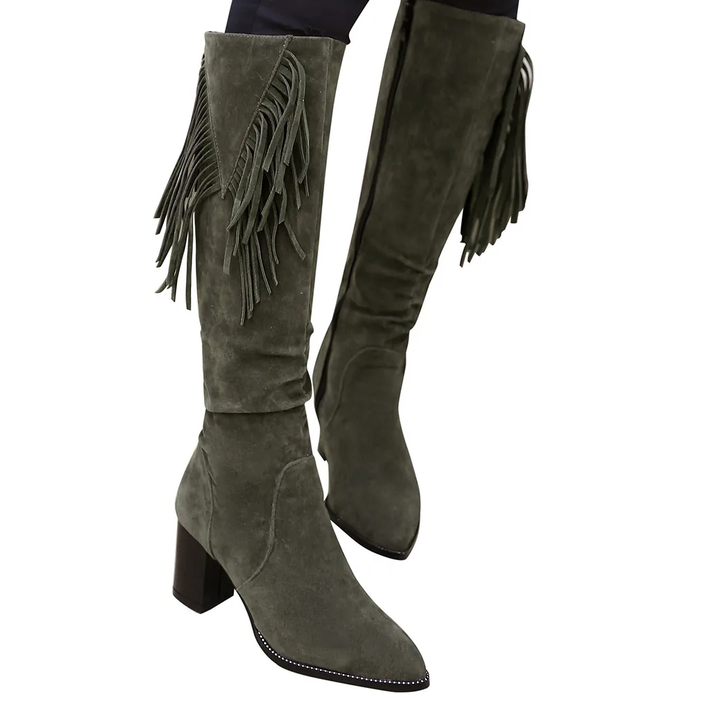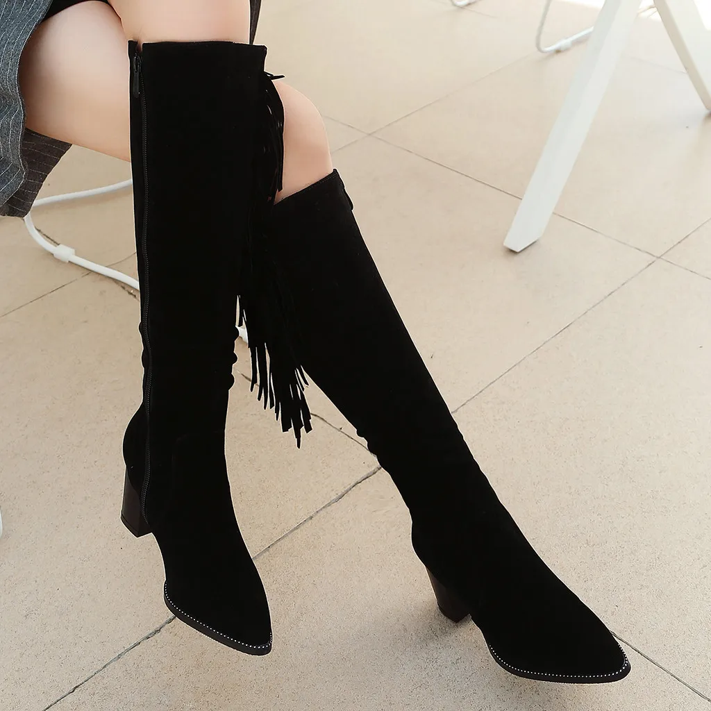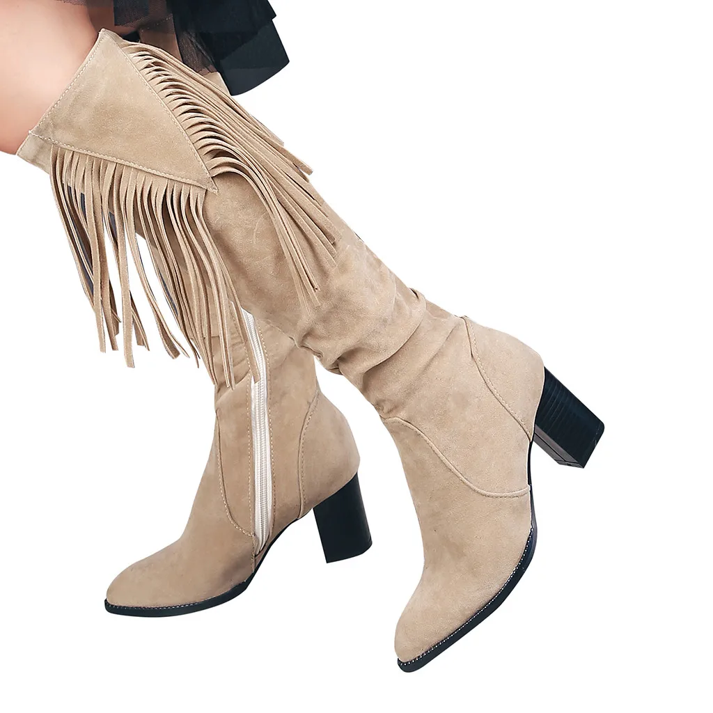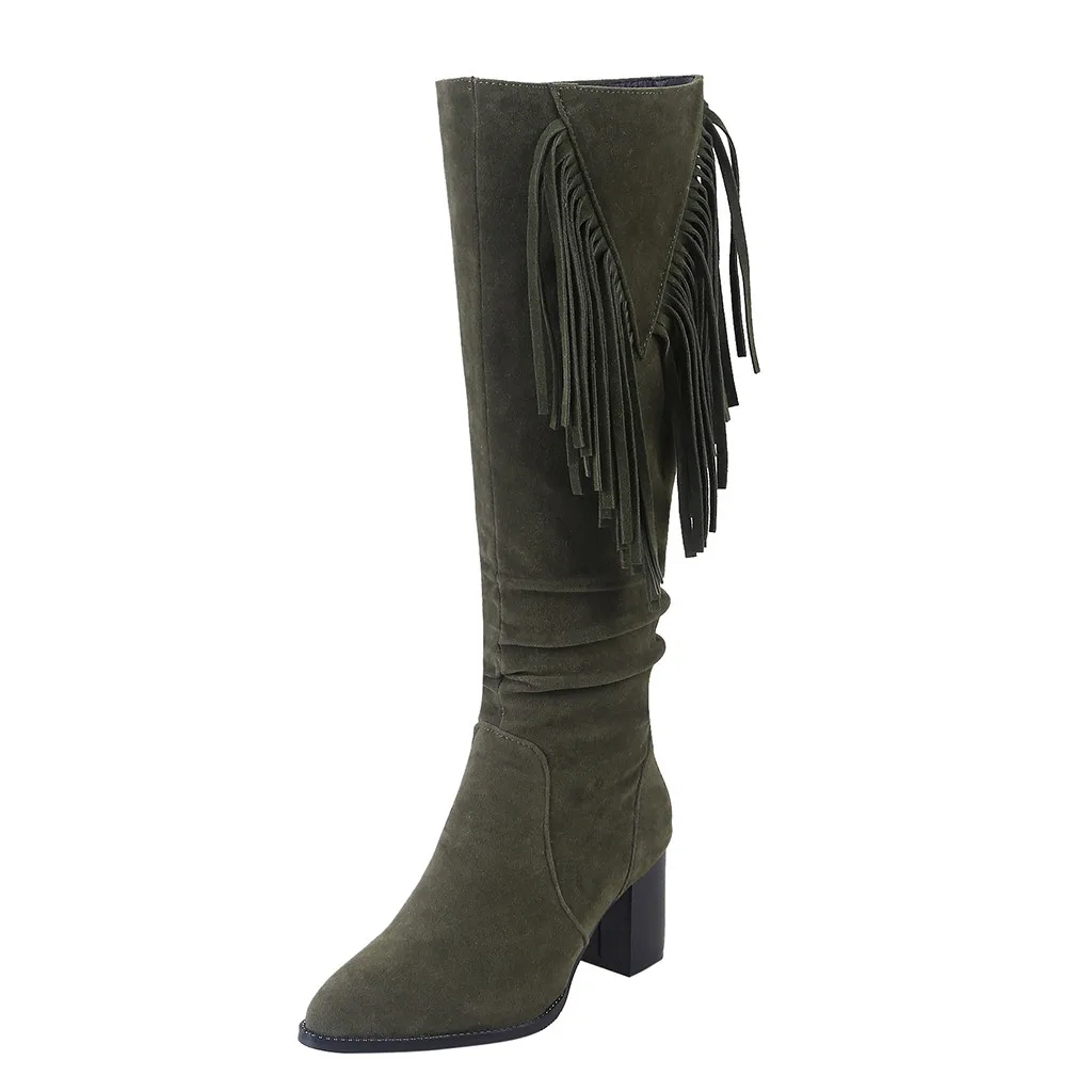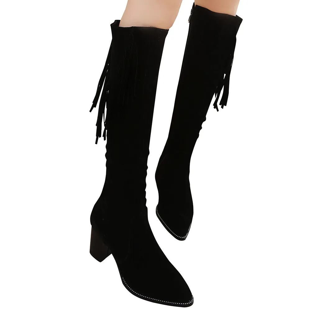 Модные однотонные винтажные женские ботинки с острым носком и бахромой на молнии и квадратном каблуке