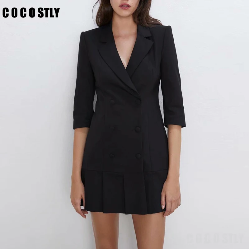 Женский костюм со складками, черный приталенный двубортный пиджак с v-образным вырезом, длинный Костюмный пиджак, осень 2019