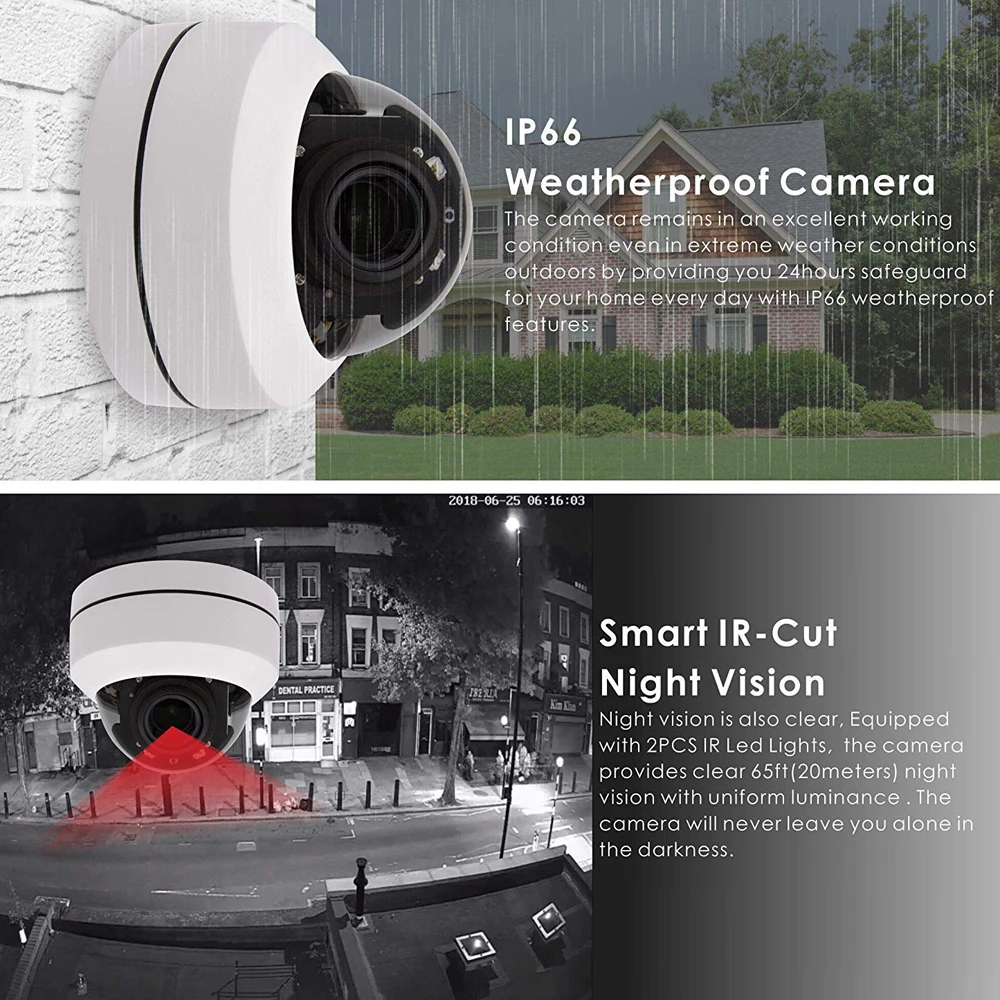 1. 2,5-дюймовый компактный размер 2. ONVIF2.4; Поддержка P2P функции 3. Поддержка сжатия H.264 (H.265) 4. Панорамирование/наклон/зум, A-B сканирование, тур доступен 5. Совместимость с HIKVISION, DAHUA, XM NVR 6. Совместимость с платформой Milestone, NUUO и AXXON Что такое POE(Power Over Ethernet)? Питание через Ethernet упрощает подключение к кабелю и установку: с этим питанием через Ethernet камеру, подключите ее только к 1 шнуру для питания и Ethernet. При использовании функции POE для работы этой камеры требуется отдельный Инжектор POE или коммутатор POE. Коммутатор POE или Инжектор POE не включены. Купол Технические характеристики Сенсор: 1/3 "CCD 2.0MP 5.0MP Пиксель: 2.0MP / 5.0MP Объектив: 2,8-12 мм, 4X BLC: Поддержка AGC: Авто/руководство WB: Авто/Руководство/для помещений/для улицы Отношение S/N:>50 дБ Протокол связи TCP/IP,HTTP,NTP,IGMP,DHCP,UDP,SMTP,RTP,RTSP,ARP,DDNS,DNS,HTTPS,P2P Программное управление: IE, CMS, платформа управления Сжатие видео: H.264/H.265/M-JPEG Сжатие звука: G711,PCM Мобильный вид (опционально): Android iPhone Диапазон вращения: панорама: 0 ° ~ 355 °, наклон: 0 ° ~ 93 ° Скорость вращения: панорама: 0 ~ 25 °/С, наклон: 0 ~ 20 °/С Чехол-книжка с: Поддержка Предустановленные точки: 220 шт. пресетов (доступно время ожидания 01-60 с интервалом) Охранные туры: 3 группы (каждая группа 16 предустановленных, время и скорость выбора) Диапазон сканирования AB: поддержка, 0-355 ° Скорость сканирования AB: 1-9 классы Рабочая температура: -40 ℃ ~ + 50 ℃ Управление меню: английский Потребление: ≤ 10 Вт Защита от молнии: переходное напряжение 6000 В Соответствующая проверка: IP66,CE,FCC,RoHs POE (питание через Ethernet) ИК параметры ИК-расстояние: до 40 метров Светодиодный s: 4 шт. массив 35Mil IR светодиодный Обратите внимание Эта POE PTZ камера не нуждается в POE сплиттер, Встроенный POE Модуль ------ Мы можем добавить аудио функцию на этой камере, просто нужно заплатить дополнительно $6, пожалуйста, свяжитесь с нами, если вам нужно добавить эту функцию, спасибо.