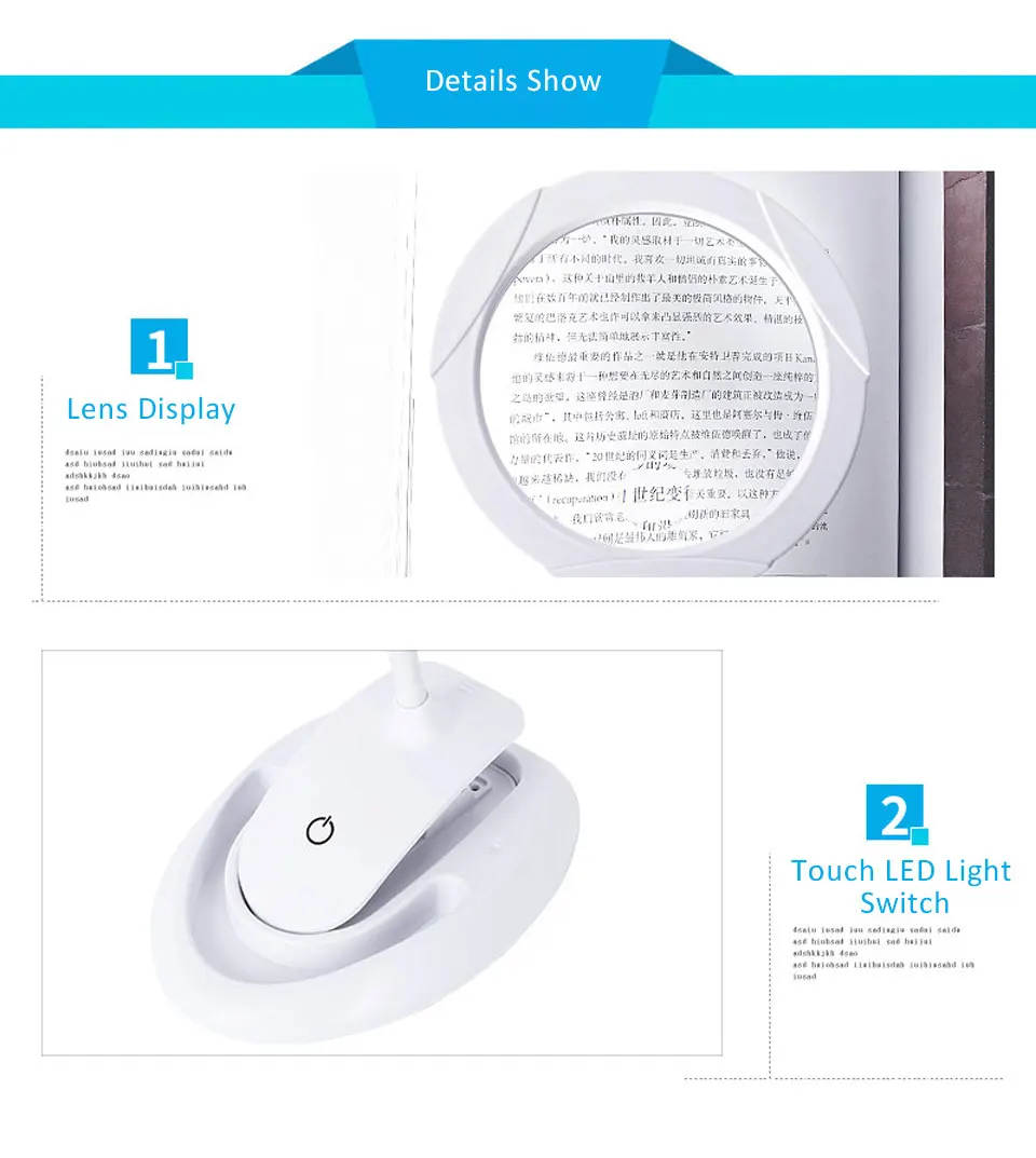 5. Приспособление может быть прочно закреплено на столешнице, прикроватной тумбочке, кромке, экономит место, обеспечивает лупу и светильник без рук. Подходит для чтения книг, шитья, вышивки крестом, вязания, изготовления ювелирных изделий, игл, живописи, вышивки, ремонта электроники и т. д.