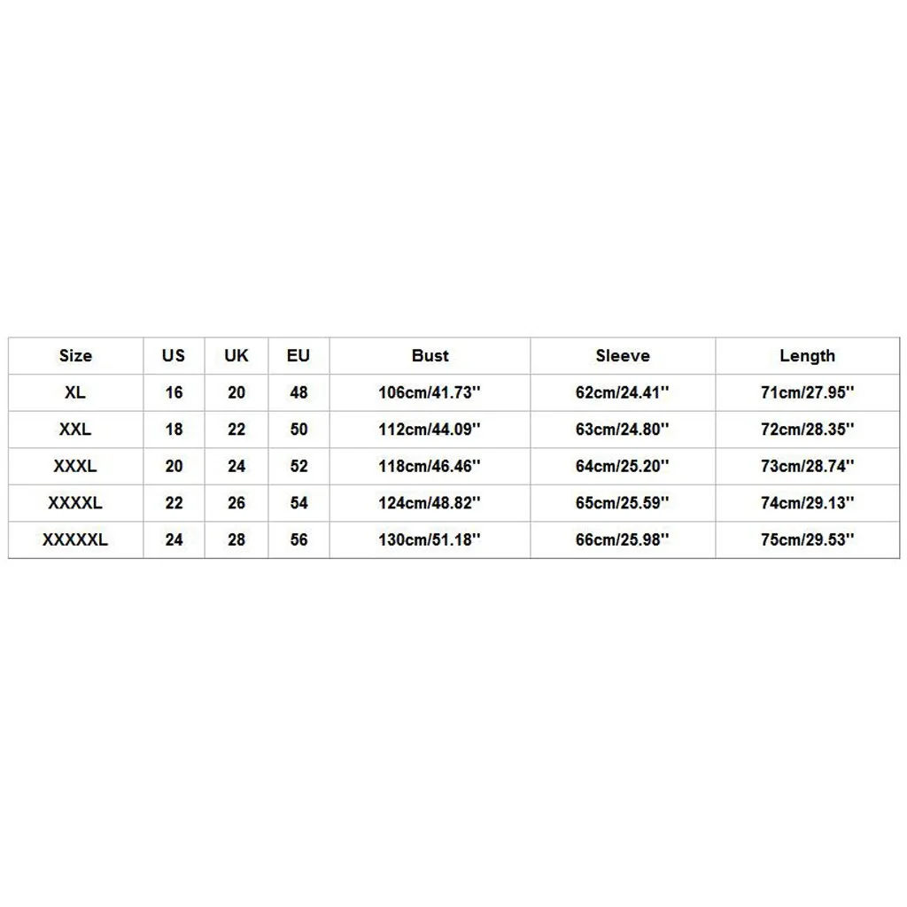 Что вы получаете: 1 шт. для женщинТопРазмер США Великобритания ЕС Бюст Рукав Длина XL 16 20 48 106 см/41,73'' 62 см/24,41'' 71 см/27,95'' XXL 18 22 50 112 см/44,09'' 63 см/24,80'' 72 см/28,35'' XXXL 20 24 52 118 см/46,46'' 64 см/25,20'' 73 см/28,74'' XXXXL 22 26 54 124 см/48,82'' 65 см/25,59'' 74 см/29,13'' XXXXXL 24 28 56 130 см/51,18'' 66 см/25,98'' 75 см/29,53''