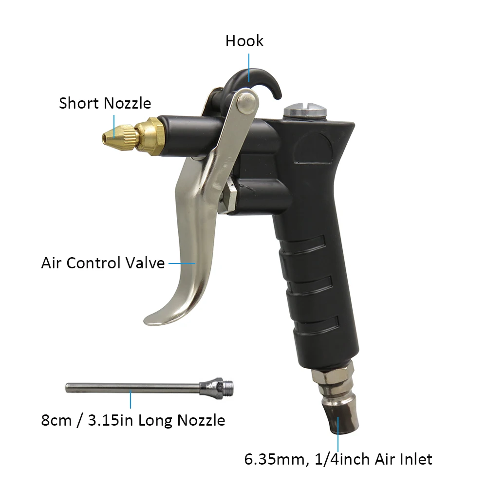 Pneumatic dust-blowing gun is ideal for cleaning confined spaces. This lightweight, pistol-grip blowgun is comfortable to use and has a trigger to control the airflow to the gun tip. Extended nozzle that can easily fit into tight spaces. Easier and more efficient.