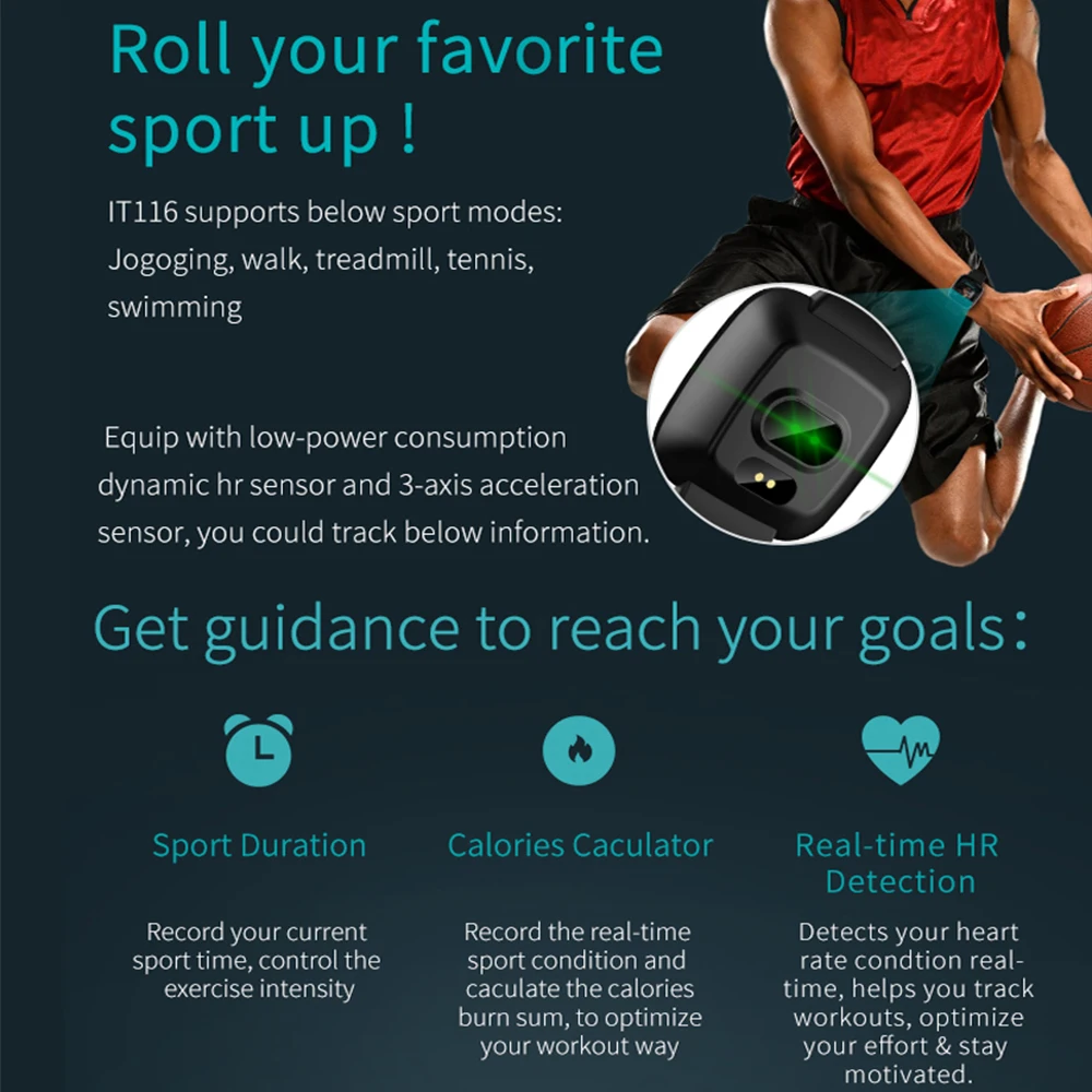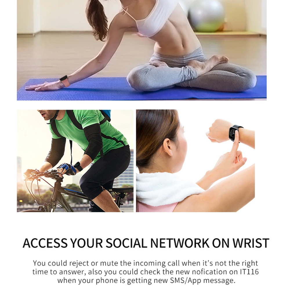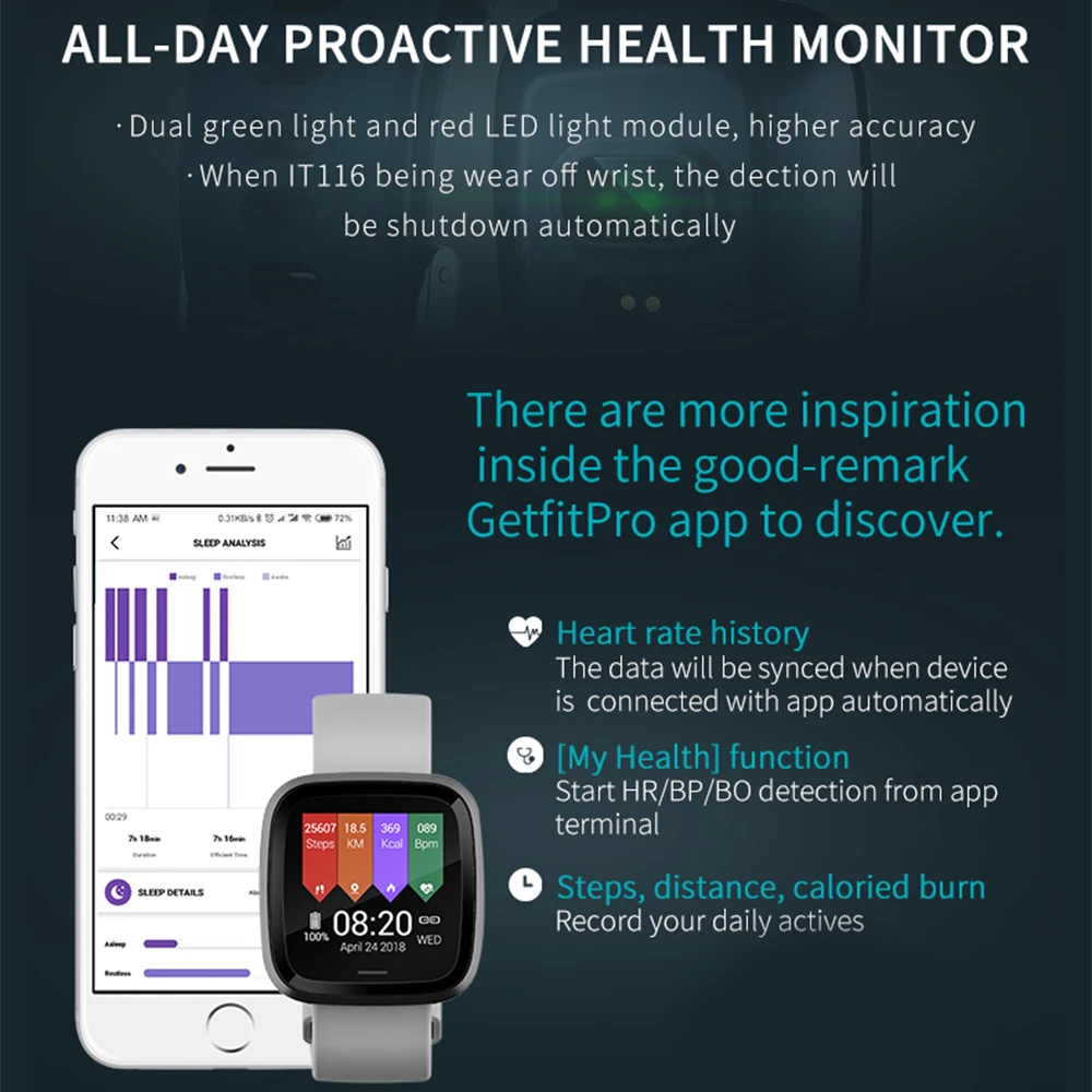 Яркий цветной дисплей и легкий интегрированный металлический корпус, литье из цинкового сплава, высокоточная форма резки с ЧПУ, процесс AF Прецизионный шлифовальный 2.5D, закаленное твердое стекло 6 H, высокоточный фотоэлектрический датчик сердечного ритма, датчик кровяного давления пульса Запись сердечного ритма автоматически синхронизируется, когда устройство подключено к приложению, и частота сердечных сокращений и обнаружение артериального давления запускаются на стороне приложения. IT116 встроенный спортивный режим, поддержка ходьбы, постоянная скорость бега, беговая дорожка, теннис, плавание, пять повседневных спортивных режимов, отображение в реальном времени ваших значений и уровней пульса, избегайте чрезмерных упражнений Вы можете легко просмотреть данные о здоровье относительного и друга в GetfFitPro и начать мониторинг сна ночью (чтобы помочь вам контролировать глубокий сон, мелкий сон и время пробуждения) Важно: Убедитесь, что Bluetooth вашего смартфона включен и подключен к смартфону через приложение «GetFitPro» вместо меню Bluetooth