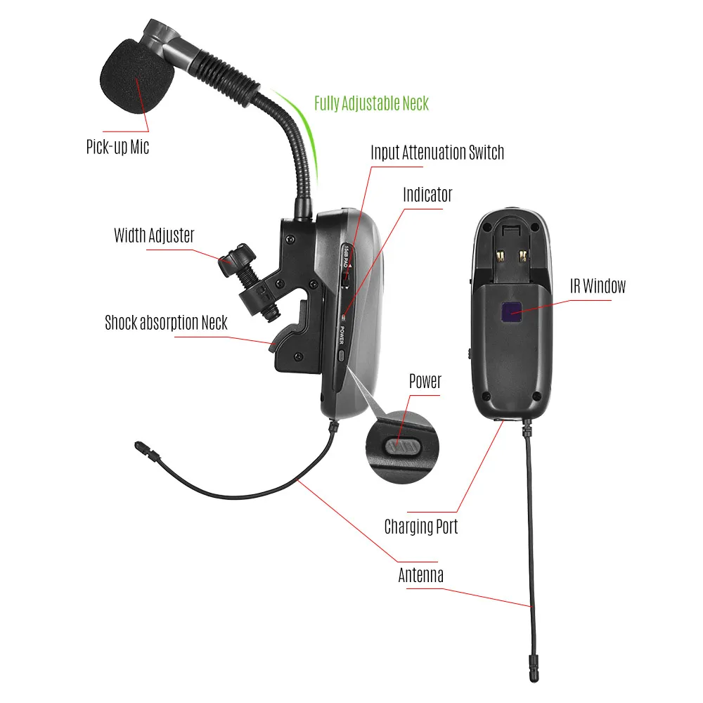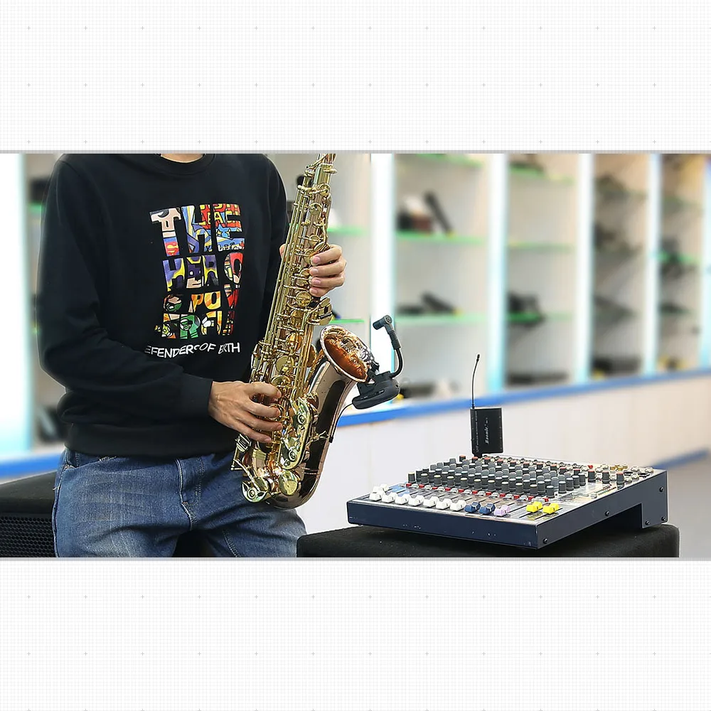 Профессиональный беспроводной системный приемник и передатчик с микрофоном специально для саксофона, а также для других ветровых инструментов, если доступны размеры зажима.