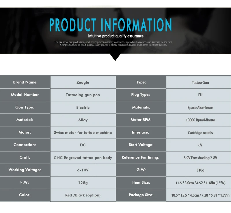 -- Материалы: космический алюминий -- Мотор: Швейцарский двигатель для тату-машины -- Мотор об/мин: 10000 об/мин -Подключение: постоянный ток -- Интерфейс: картридж needls -- Ремесло: с ЧПУ гравировкой тату ручка тела -Пусковое напряжение: 6 В -Рабочее напряжение: 6-10 в -- Ссылка на подкладку: 8-9 В для: затенения 7-8 в -- Стандартный ход: 3,5 мм -- N.W:128g -- G.W:310g -Цвет: красный/черный (вариант) -Товар Размеры: 11,5*3,0 см/4,52 * 1.18in (Д * Ш * В) -- Посылка Размеры: 18,5*13,5*4,5 см/7,28*5,31 * 1.77in
