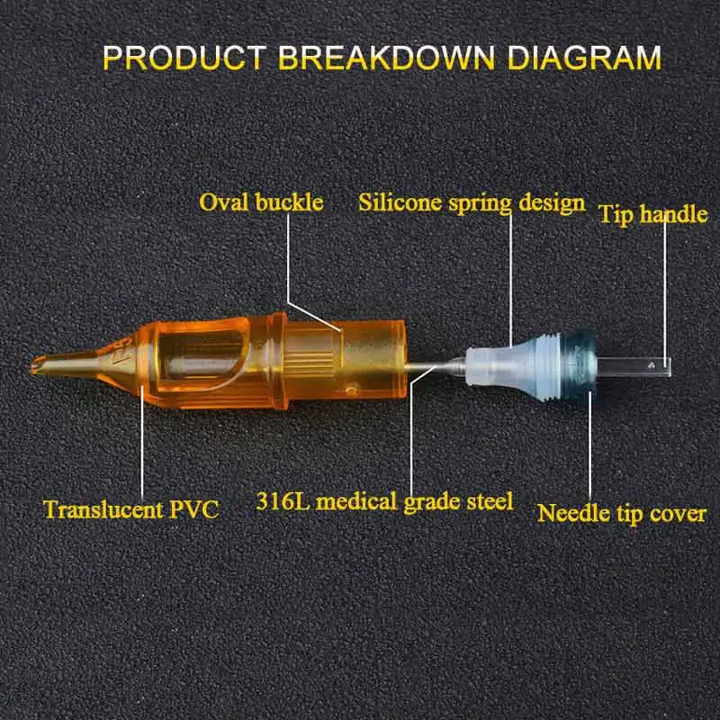 1. Иглы картриджей для татуировок сделаны из точной формы, с низким уровнем шума, это поможет профессиональному татуировщику. 2. RL/RM/M1/RS четыре дополнительных типа с несколькими размерами будут соответствовать различным иглы татуировки. 3. Более того, одноцелевой материал быстро заменяется и обеспечивает идеальную, несложную и гигиеническую работу.