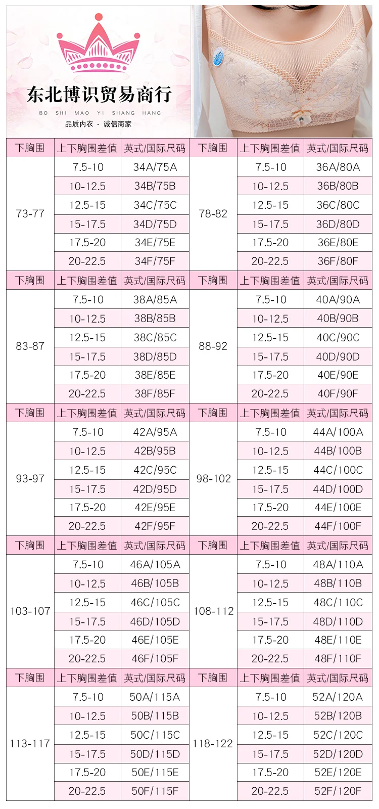 Product Name: Holo Silva No Rims Thin Seamless two shoulder straps Front opening buckle Sexy Lingeries Women bras plus size 42D 44D 46D women's underwear Band Size: 36=80 38=85 40=90 42=95 44=100 46=105 Cup Size: B C D Material: Polyester+Cotton+Spandex+Nylon+Lace Package included: Bra *1 Hook and Eyes: Four Warm Remind: This Bra is Asian Size,Please takes one size up.For example 36/80D in US,38/85D for this one.