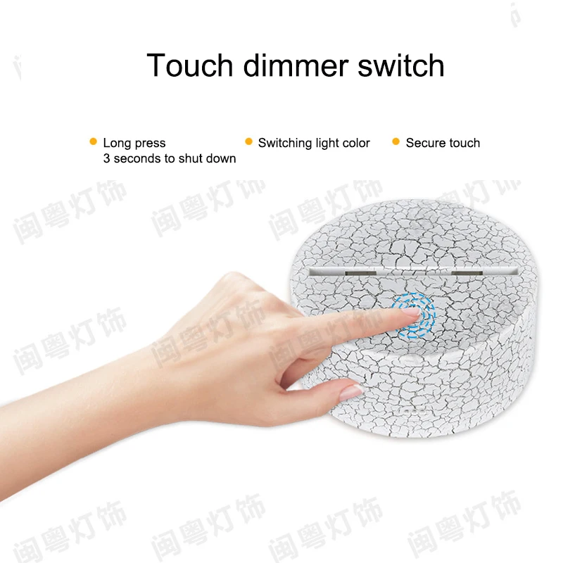 Наименование товара: Новинка Светодиодный 3D ночной Светильник Напряжение: 5 В Ватт: 2 Вт Цвета: 7 цветов Управление: 1,Touch,2,Touch + Rmote (Сенсорный пульт) Базовый размер: d85xh37.4мм Питание: 1, аккумулятор (не входит в комплект) 2, usb-провод