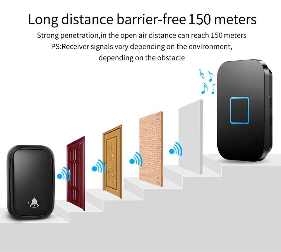 1. Нажмите кнопку, супер обучающий код может свободно научиться сочетать, может быть неограниченным подходящим приемником. 2. Вместо использования батареи, кнопка преобразует кинетическую энергию в электрическую и посылает сигнал при нажатии. 3. Передатчик может нормально работать в снежной или высокой температуре окружающей среды, водонепроницаемый и пыленепроницаемый. 4. Если несколько кнопок соединены с одним или несколькими приемниками в одной системе, каждая кнопка может быть установлена на другой мелодии звонка. 5. Функция отключения памяти: Включите питание снова после выключения питания, не нужно повторно регулировать и блокировать мелодию звонка. 6. Приемник доступен в различных вилках, штепсельных вилках США/ЕС/Великобритании и адаптерах Австралии, подходит для большинства стран. 7. Привлекательная подсветка мигает, когда кто-то толкает дверной звонок. Особенно подходит для пожилых, глухих и беременных женщин. 8. Напряжение приемника составляет 220 В. 9. Приёмник находится на расстоянии 150 метров (в открытой местности), что может зависеть от окружающей среды и препятствий. 10. Приемник имеет 60 мелодий звонка на выбор, а громкость 0-110 дБ на 5 уровнях. 11. Просто подключите приемник к электрической розетке, кнопочный передатчик может быть приклеен к двери с помощью клейких лент. 12. Размер передатчика: 70*46*24 мм, Размер приемника: 92*62*32 мм Примечание: Кнопка не может быть размещена на железной двери, потому что это будет мешать сигналу. Если приемник не звонит при нажатии кнопки после получения дверного звонка, Пожалуйста, подключите дверной звонок.