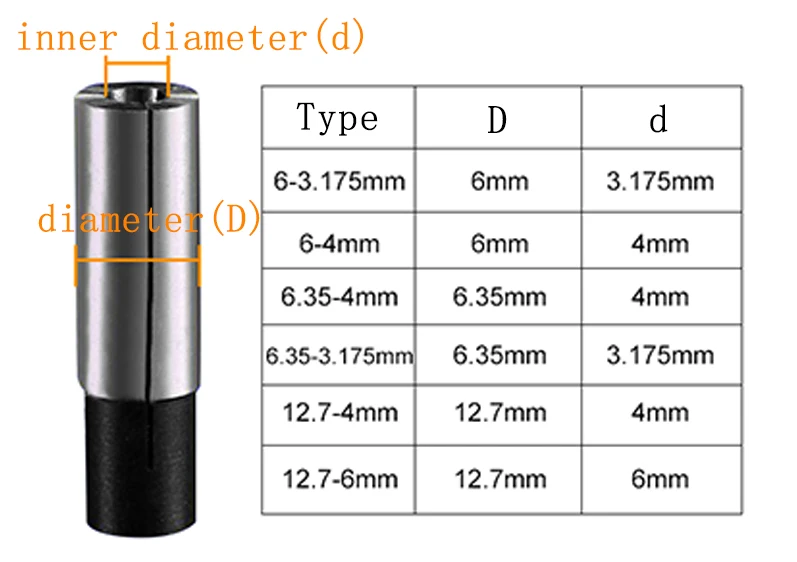 -В комплект входят 6 мм и 6,35 мм всех типов, всего 4 Деталь продукта: 6,35 мм-4 мм 6,35 мм-3,175 мм 6 мм-3 мм 6 мм-4 мм B-В комплект входят 12,7 мм всех типов, всего 6 шт продукта: 12,7 мм-3,175 мм 12,7 мм-4 мм 12,7 мм-6 мм 12,7 мм-6,35 мм 12,7 мм-8 мм 12,7 мм-10 мм