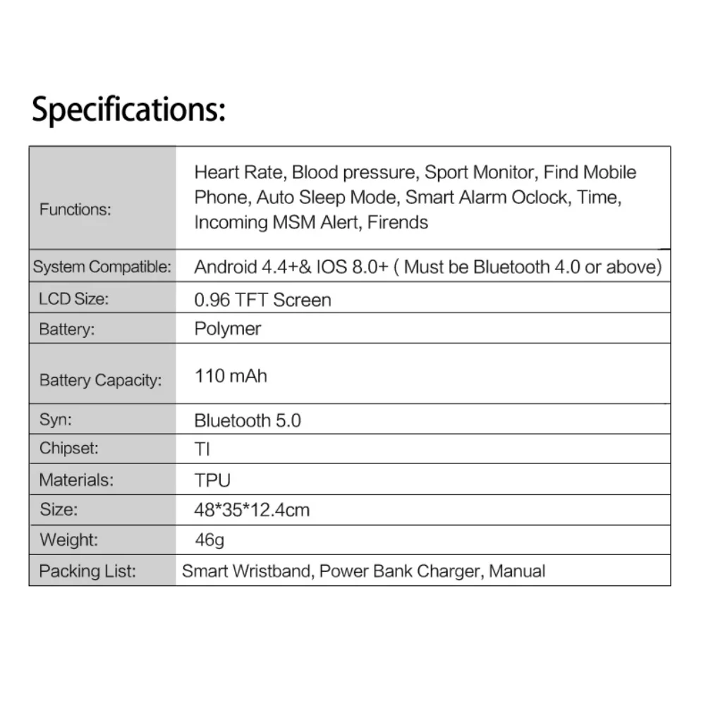 4. Высокая производительность: цветной TFT экран 0,96 дюйма, разрешение 80*160, Совместимость с версией Bluetooth 5,0, подходит для Android 7,0 и IOS 12.