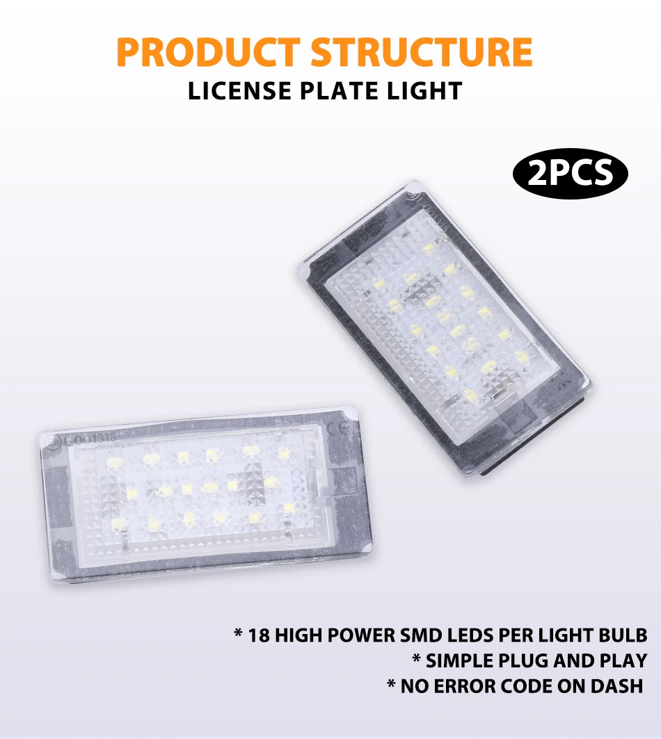 Характеристики: Тип СВЕТОДИОДА: 3528 SMD Количество СВЕТОДИОДНЫЙ: 18 шт. (каждая лампа) Цвет светильника: 6000-6500K Особенности: Он оснащен одной парой высокой мощности без ошибок светодиодный номерной знак Каждый светильник номерного знака оснащен 18 3528 SMD светодиодный, производящий супер яркий светильник. Прямая установка, без проводки или модификации, просто подключите и играйте. Нет ошибок obc на всех моделях приложений. Применение: Для BMW 1998-2003 E46 2D Pre-facelift Для BMW 1998-2003 E46 M3 Pre-facelift Эта лампа подходит только для автомобиля с рукояткой/ручкой для крышки багажника 24,25 дюйма. Посылка включает в себя: 1 * пара светодиодный светильник номерного знака