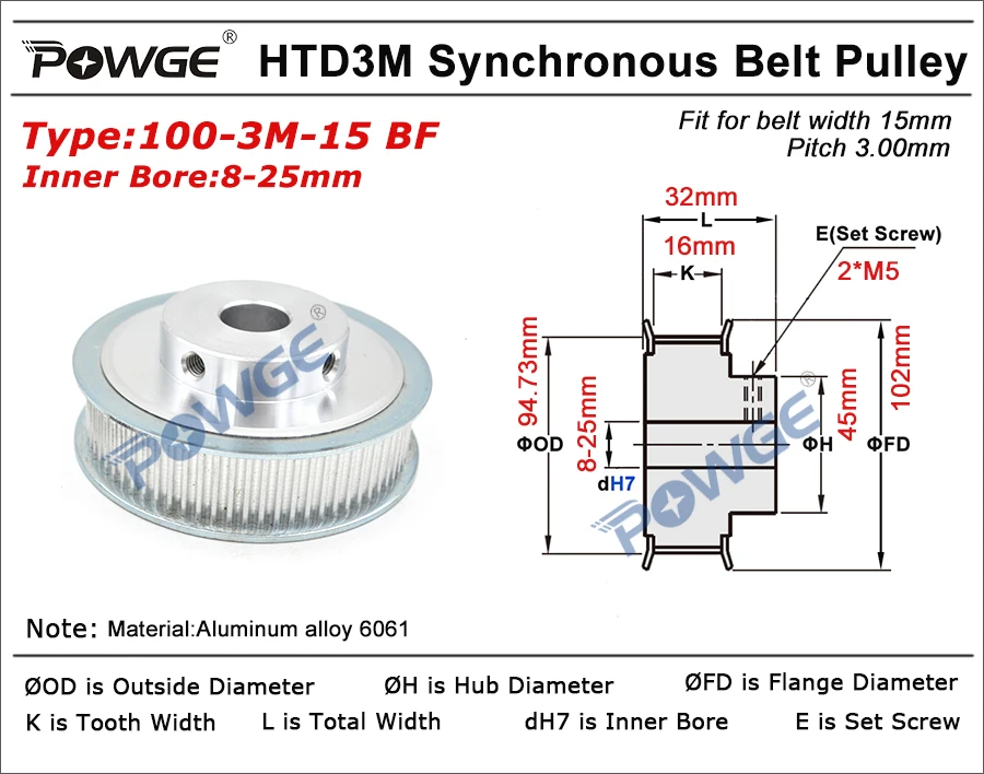 Алюминиевый сплав100 зубьев3 м шкив TimimgДиаметр: 8/10/12/14/15/17/19/20/25 мм100-3M-15 BFforШирина 15 ммHTD 3 м Синхронный шаг ремня 3 мм 100 зубьев 100T HTD3M шкив ремня лазерная гравировка CNC машина