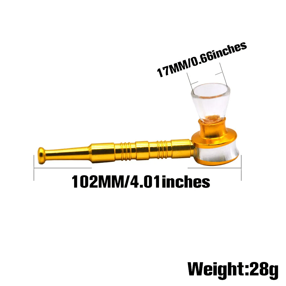 Материал: высококачественное стекло и алюминиевый сплав Диаметр стеклянной чаши: 17 мм/0,66 дюйма Длина: 102 мм/4,01 дюйма Вес нетто: 28 г/шт. Цвет: черный/красный/золотой/синий/зеленый/серебристый (6 видов цветов полностью) Использование: для курения табака