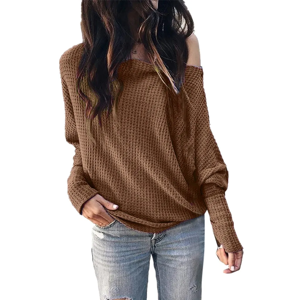 Women Fashion Leaked Shoulder Solid Color Print Loose Bat Long Sleeve Top