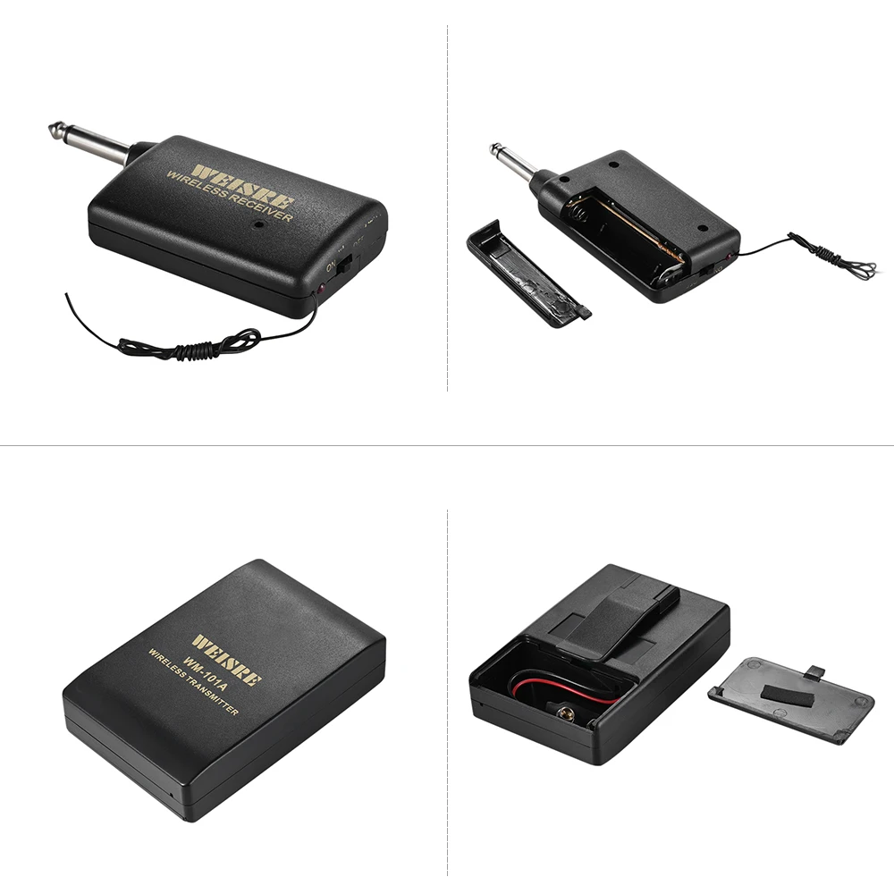 Микрофонный кабель длиной до 100 см/39in, передатчик с регулятором громкости и светодиодный индикатор, 6,35 мм разъем беспроводного приемника.