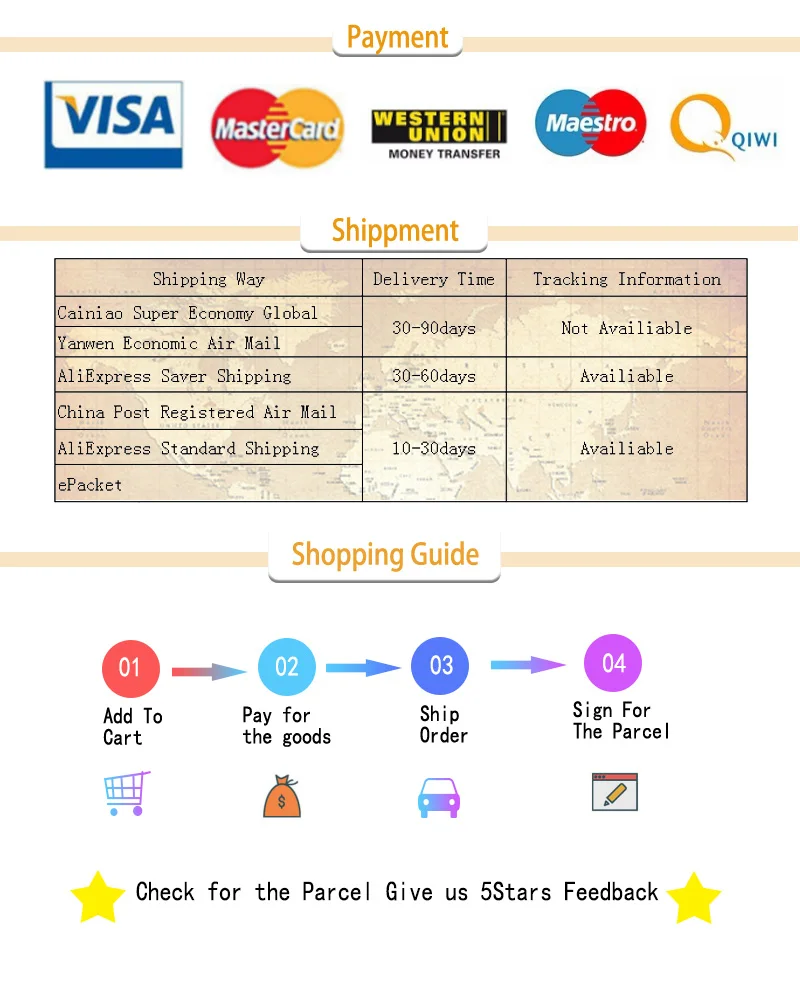 Добро пожаловать в наш магазин, уважаемые покупатели, когда вы размещаете заказ, мы отправим его как можно скорее, около 3 дней, если он будет в продаже. Когда посылка была отправлена, пожалуйста, будьте терпеливы. Если время получения почти закончилось, вы можете связаться со мной, и мы продлим время.