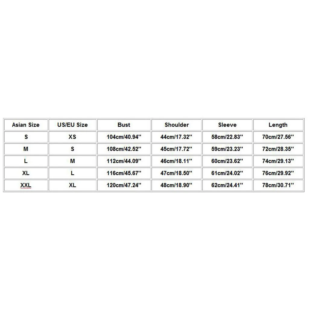Asian SizeUS/EU SizeBustShoulderSleeveLengthSXS104cm/40.94''45cm/17.71''62cm/24.41''70cm/27.56''MS108cm/42.51''46cm/18.11''63cm/24.80''72cm/28.35''LM112cm/44.09''47cm/18.50''64cm/25.20''74cm/29.13''XLL116cm/45.66''48cm/18.89''65cm/25.59''76cm/29.92''XXLXL120cm/47.24''49cm/19.29''66cm/25.98''78cm/30.71''