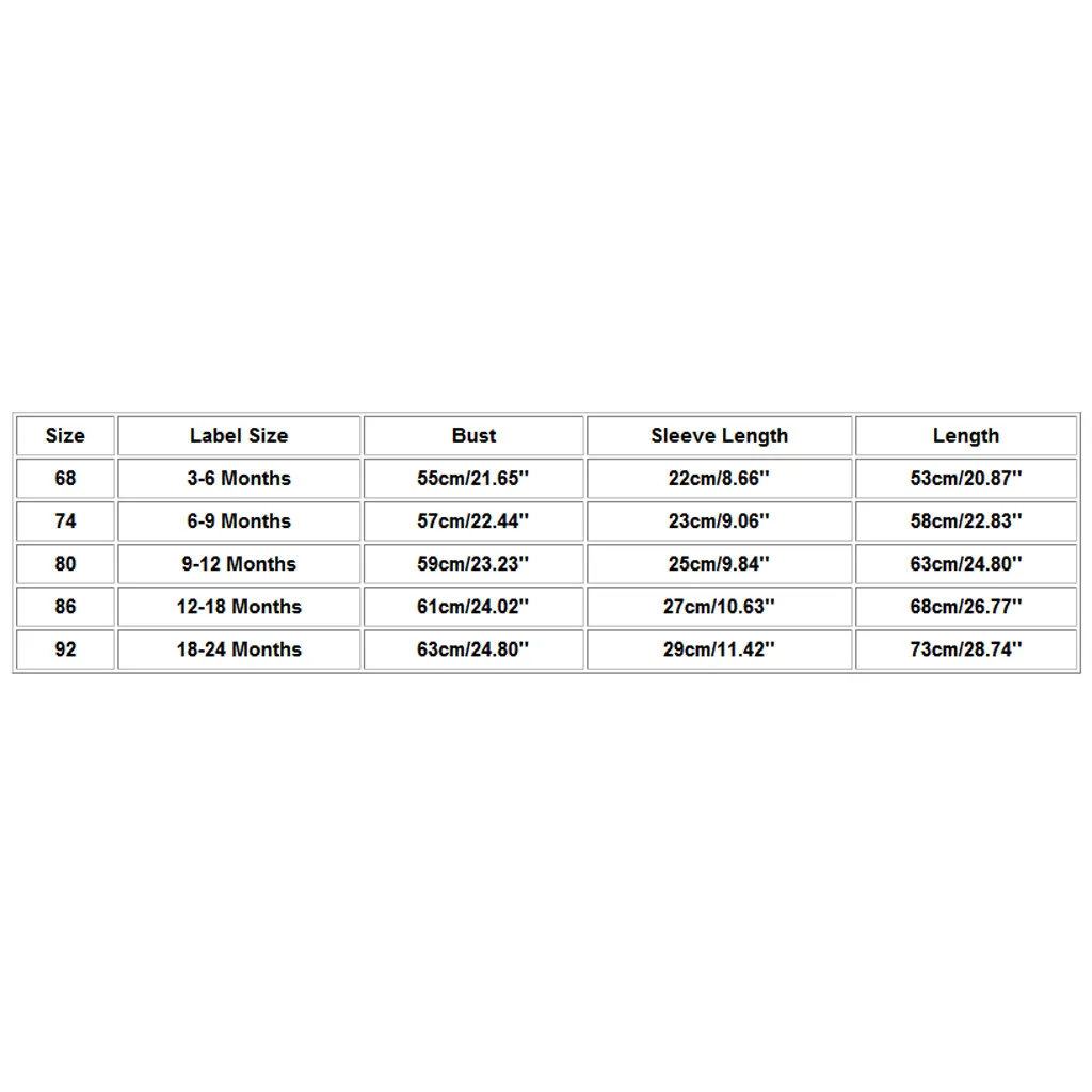 Size Label Size Bust Sleeve Length Length 68 3-6 Months 55cm/21.65'' 22cm/8.66'' 53cm/20.87'' 74 6-9 Months 57cm/22.44'' 23cm/9.06'' 58cm/22.83'' 80 9-12 Months 59cm/23.23'' 25cm/9.84'' 63cm/24.80'' 86 12-18 Months 61cm/24.02'' 27cm/10.63'' 68cm/26.77'' 92 18-24 Months 63cm/24.80'' 29cm/11.42'' 73cm/28.74''