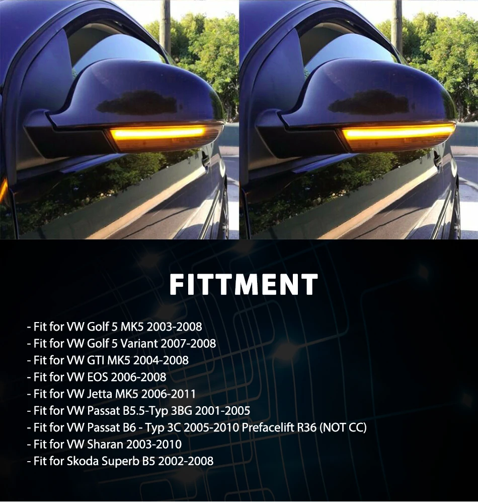 Описание товара: В комплект входит: 2 шт. зеркальный светильник заднего вида (слева и справа) Сигналы поворота потока воды Установка: просто нужно удалить ваш оригинальный светильник и установить наш послепродажный светодиодный светильник Цвет корпуса: дымчатый с бежевым нижним корпусом, как показано на картинке Цвет светильника: желтый Длительный срок службы, более безопасный, 100% водонепроницаемый Примечание: инструкции по установке не включены. Фиттинг: Подходит для VW Golf 5 MK5 2003-2008 Подходит для VW Golf 5 Variant 2007-2008 Подходит для VW GTI MK5 2004-2008 Подходит для VW EOS 2006-2008 Подходит для VW Jetta MK5 2006-2011 Подходит для VW Passat B5.5-Typ 3BG 2001-2005 Подходит для VW Passat B6 - Typ 3C 2005-2010 Prefacelift R36 (не CC) Подходит для VW Sharan 2003-2010 Подходит для Skoda Superb B5 2002-2008