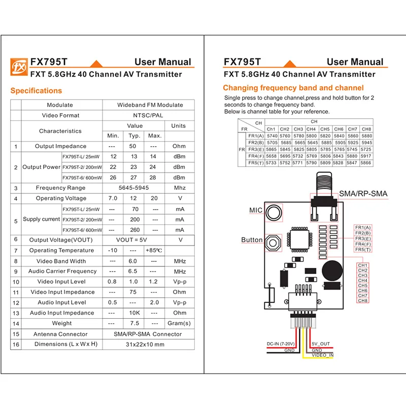 Размер: 31*22*10 мм Вес: 7,5 г Разъем антенны: антенна SMA Формат видео: NTSC/PAL Ток поставки: 200 мВт (200мА) 600 мВт (260ма) Частотный диапазон: 5645-5945 МГц Выходное напряжение: 5 В Рабочее напряжение: 7-20 в Примечание: По умолчанию мощность 25 МВт Отрежьте соединение и мощность становится 200 мВт или 600 мВт