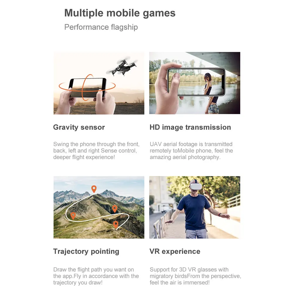 Цвет: стильная обувь; Цвета: черный Подходящий возраст: 14 лет или старше Внешний материал: АБС-пластик Канал: 4 канала Гироскоп: 6 осей Частота конфигурации: 2,4 ГГц Расстояние дистанционного управления: около 100 метров Время зарядки: около 120 минут Время полета: 15-18 минут или около того Метод передачи: с видом от первого лица Фото пикселей: фронтальная камера: 4096x3072 P Нижняя Камера: 640*480 P Разрешение видео: фронтальная камера: 2048*1080 P, нижняя Камера: 640*480 P Режим записи фотографий: пульт дистанционного управления + управление приложением Батарея дистанционного управления: батарея 4 * AAA (самоприобретаемая) Авиационная Аккумуляторная батарея: 7,4 в 1200 мАч литиевая батарея (в комплекте) Характеристики продукта: самолет с одной кнопкой взлета/посадки и горизонтальной функцией выравнивания, FPV в режиме реального времени воздушной передачи, траектория функция полета и безголовая функция, возврат одной кнопки, функция позиционирования оптического потока и регулируемая камера, функция переключения двойной камеры, передача изображения WiFi. Подъем/спуск/вперед/назад/влево/вправо/левая и правая сторона летают и т. д. контроль ладони, фото жестов, видео жестов, мВ, изображение на картинке, Разделенный экран. Обратите внимание: 1. Из-за разницы между различными мониторами, изображение может не отражать фактический товар, пожалуйста, учитывайте это перед покупкой. 2. Возможны отклонения на 1-3 см из-за ручного измерения. Спасибо за понимание.