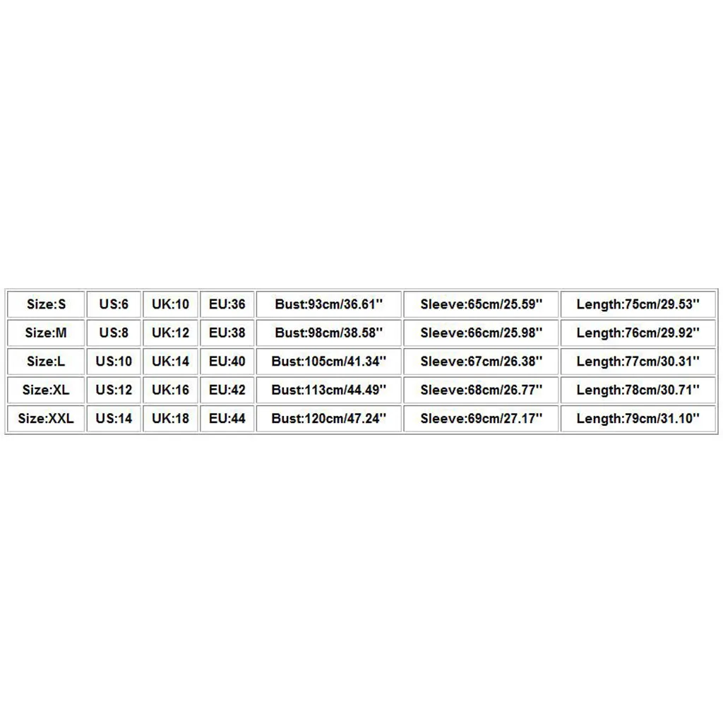 Размер Свяжитесь с нами Великобритания ЕС Обхват груди Рукава Длина S 6 10 36 93 см/36,61'' 65 см/25,59'' 75 см/29,53'' М 8 12 38 98 см/38,58'' 66 см/25,98'' 76 см/29,92'' L 10 14 40 105 см/41,34'' 67 см/26,38'' 77 см/30,31'' XL 12 16 42 113 см/44,49'' 68 см/26,77'' 78 см/30,71'' XXL 14 18 44 120 см/47,24'' 69 см/27,17'' 79 см/31,10''